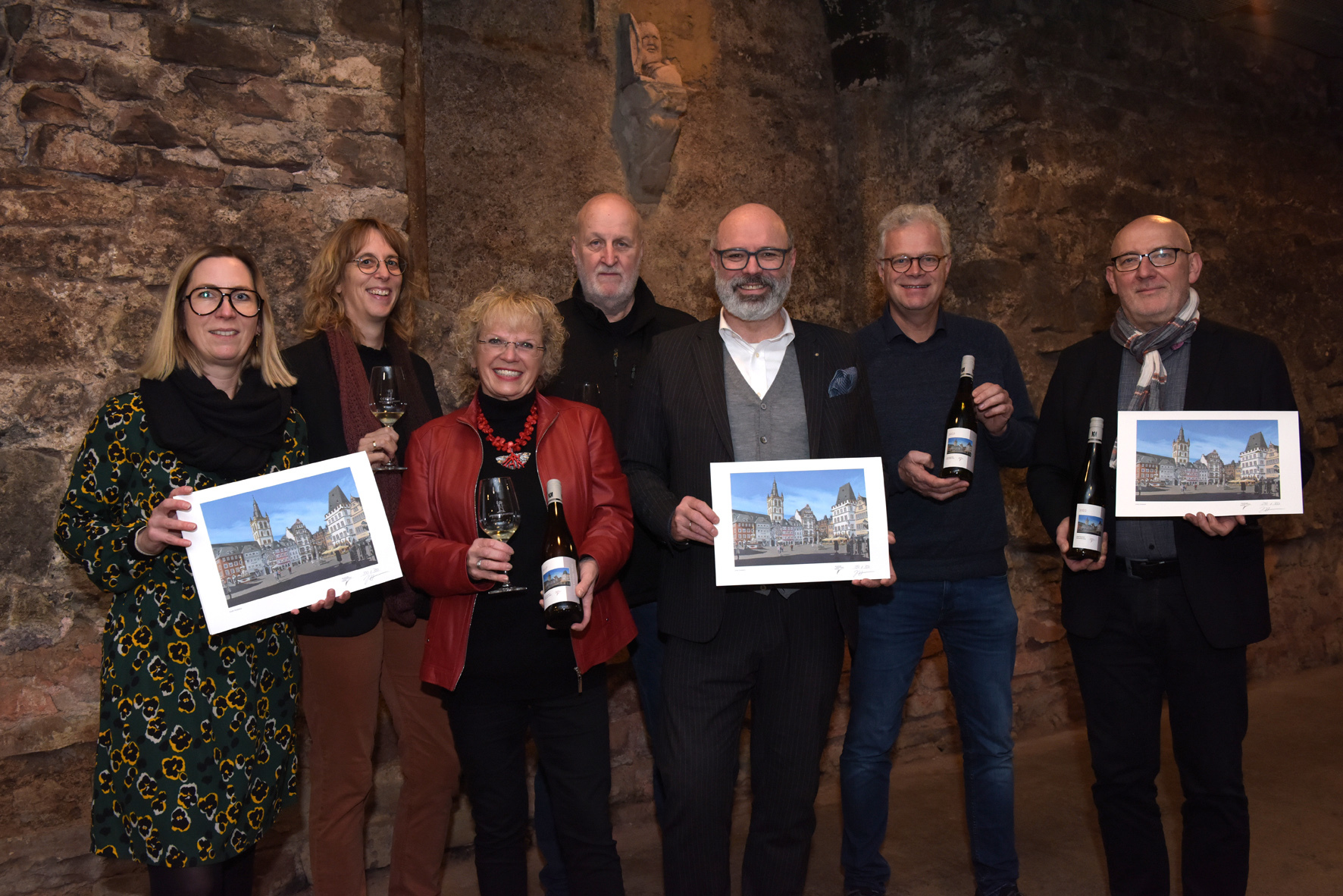 Von Dr. Andreas Ammer, dem Vorsitzenden der Kulturstiftung Trier, konnte man anschließend erfahren, dass das VDP-Weingut bereits in der 9. Auflage den Spendenwein für die Kultur in Trier zur Verfügung stellt. Er ergänzte: "Mit jeder verkauften Flasche sind zwei Euro Spende für die Kulturstiftung verbunden. Der Erlös wird zur Kulturförderung und Finanzierung von Projekten der kulturellen Teilhabe in Trier verwendet."Das Etikett des aktuellen Spendenweins und gleichzeitig die Trierer Kulturaktie 2023 wurden von Josef Hammens künstlerisch gestaltet. Es zeigt eine fotorealistische Ansicht des Trierer Hauptmarktes. Von dem Originalbild, das, so Hammens, eine Größe von 160x110 cm hat, wurden 300 Stück handsignierte Drucke in einer Größe von 30x40 cm erzeugt. Diese sind für 50 € zu erwerben. "Der gesamte Betrag wird - abzüglich der Herstellungskosten - der Kulturförderung in Trier zur Verfügung gestellt", so Dr. Andreas Ammer. Für ihn sei dies, Wein und Werk, "die perfekte Geschenkidee, wenn man Genuss und Kultur miteinander verbinden möchte." Er fügte hinzu, dass er den Hauptsinn der Kulturstiftung darin sehe, "dass die Gemeinschaft der Bürgerinnen und Bürger Triers durch die die Kulturstiftung in besonderer und positiver Weise gefördert und gestärkt wird."