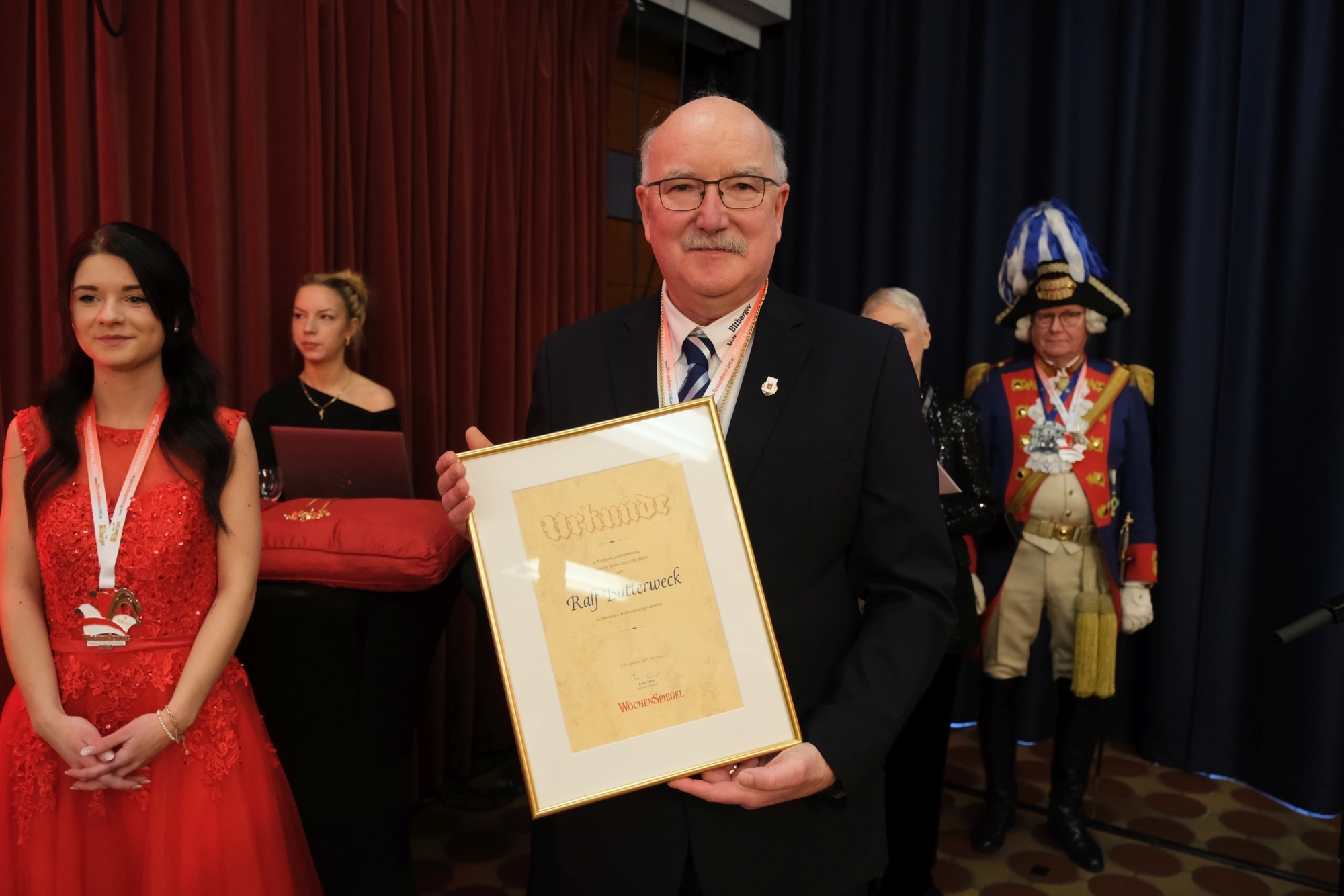 Der WochenSpiegel-Ehrenorden in der Kategorie Kultur ehrt dich für dein aktives Engagement und dein stetes Bemühen, die Tradition und das Bestehen des kulturellen Guts "Volkstanz" am Leben zu halten und insbesondere unter Einbindung der Jugend dafür zu sorgen, dass dieser Brauch nicht in Vergessenheit gerät. In diesem Sinne freuen wir uns, dass du unsere Einladung heute Abend angenommen hast und überreichen dir - von Herzen und mit den allerbesten Wünschen - den WochenSpiegel-Ehrenorden in der Kategorie Kultur.