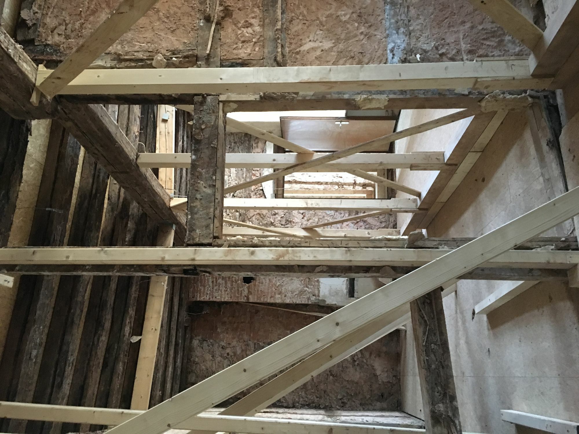 Schon von weitem ist die riesige weiße Plane erkennbar, die das Gebäude umhüllt. Unabhängig von Wind und Wetter kann unter dem Notdach, das wie ein riesiges Festzelt anmutet, gearbeitet werden. Außerdem schützt die Verkleidung das Haus Warsberg, dessen Dachstuhl bei dem Brand am 19. August 2018 in Flammen aufging. Unter der Plane befindet sich das entkernte Gebäude. Neben dem Feuer hat auch das Löschwasser seine Spuren hinterlassen, denn das Stroh-Lehm-Gemisch zwischen den Deckenbalken hat sich mit Feuchtigkeit vollgesogen und musste daher entfernt werden. Außerdem wurden spezielle Maschinen eingesetzt, um der verbleibenden Substanz das Wasser zu entziehen.