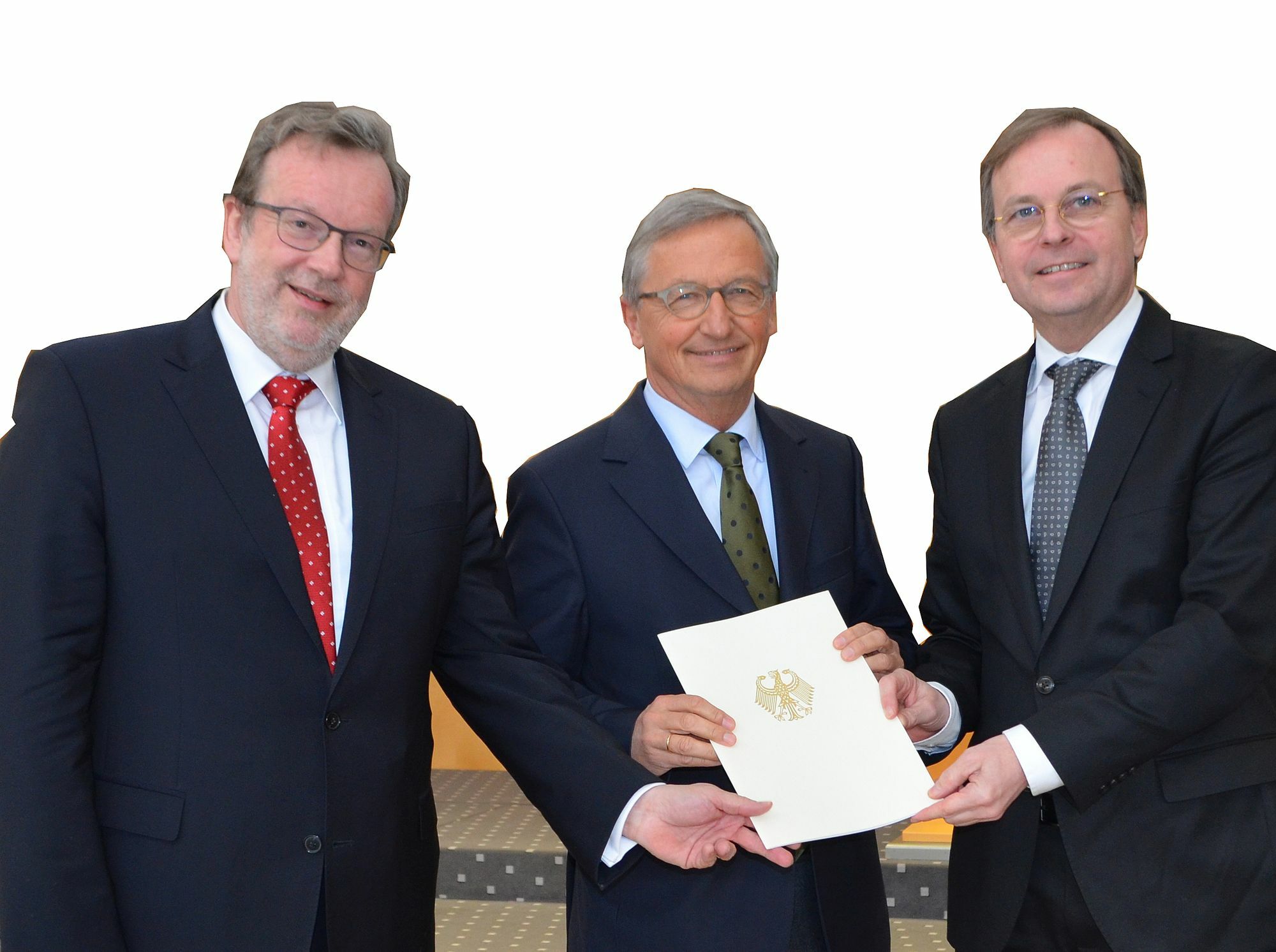 Blicken anlässlich des Richtfestes voller Optimismus in die Zukunft (v. l.): Thomas Sandner, Handwerkskammer-Geschäftsführer und Leiter des Berufsbildungs- und Technologiezentrums (BTZ), HWK-Hauptgeschäftsführer Axel Bettendorf und HWK-Präsident Rudi Müller. Foto: Finkenberg