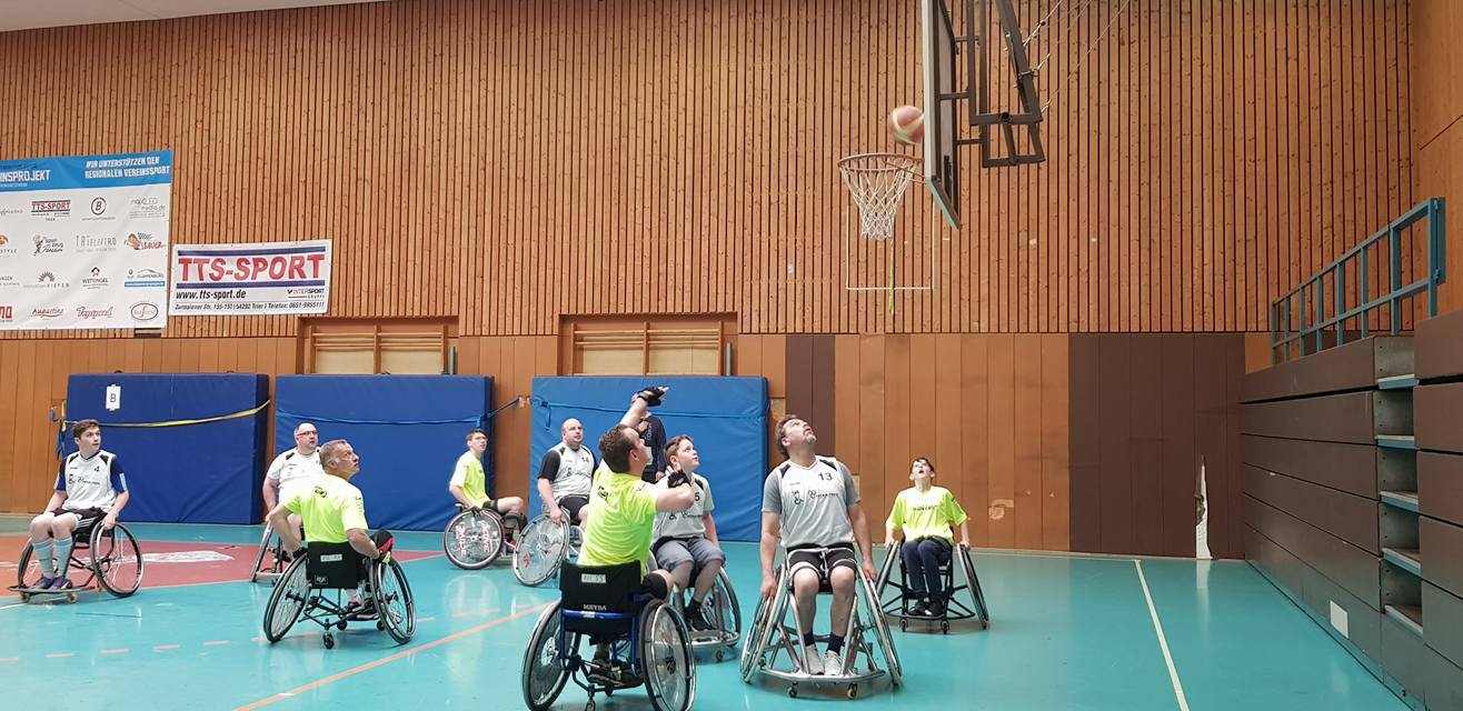 Sage und schreibe 16 Mannschaften sind angemeldet, bestehend aus fast nur "Fußgängern", also nicht behinderten Menschen, die den Sport einfach einmal ausprobieren möchten. Auf zwei Kleinfeldern wird in zwei Gruppen im Modus jeder-gegen-jeden gespielt und schließlich die Platzierungsspiele der jeweils gleich platzierten Teams beider Gruppen. Schiedsrichter und Betreuer sind Rollstuhlbasketballer vom Erstligisten Doneck Dolphins Trier, die bis zur Siegerehrung um 18 Uhr insgesamt 64 Spiele je 10 Minuten leiten werden.