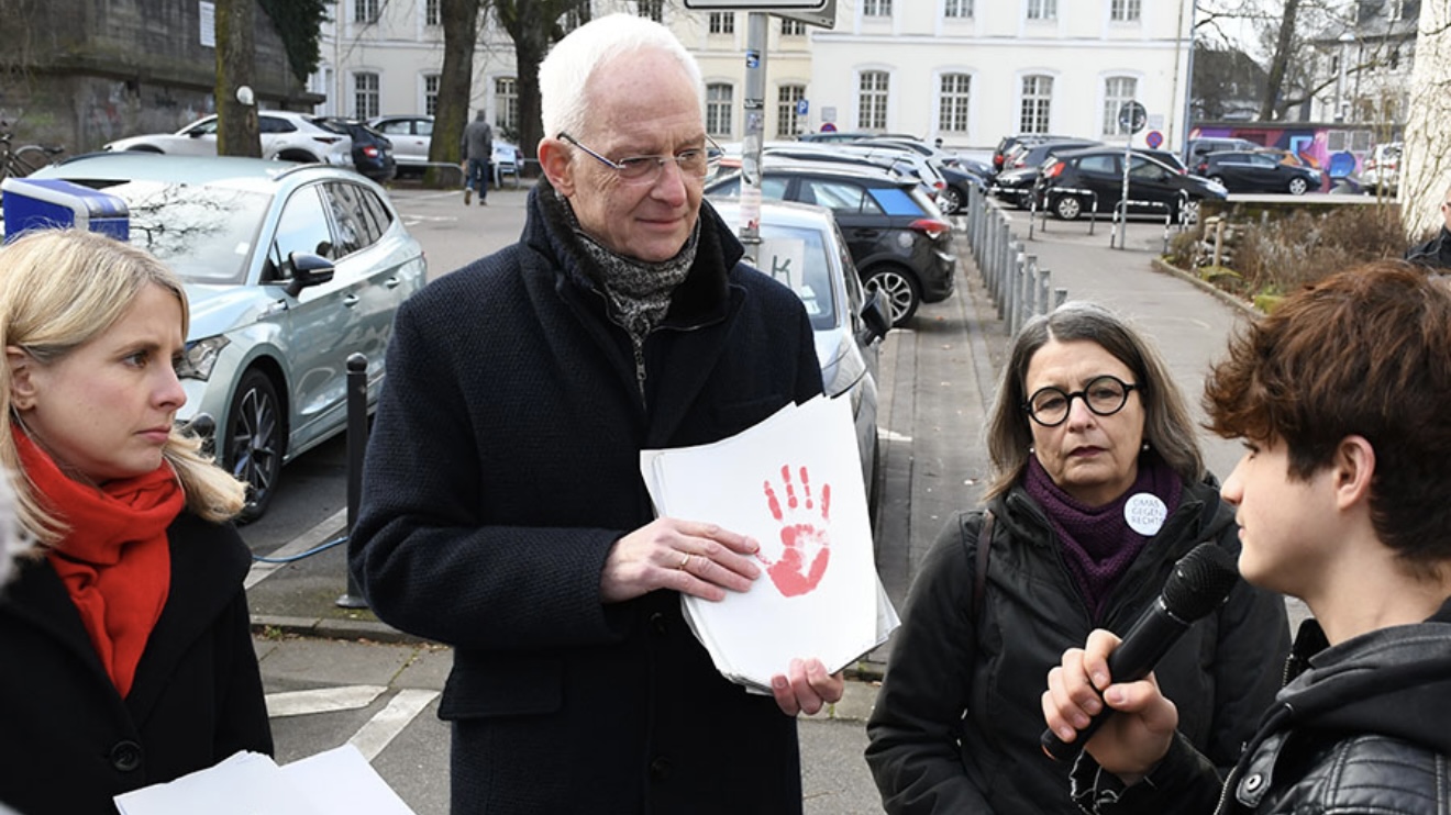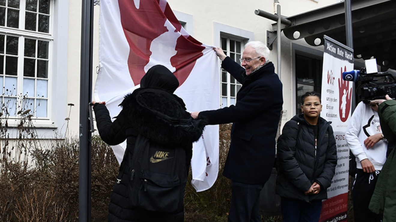 Im Anschluss an die Übergabe hisste Oberbürgermeister Wolfram Leibe gemeinsam mit den Schülerinnen und Schülern die rote Hand-Fahne am Rathaus. Dieses symbolträchtige Zeichen soll daran erinnern, dass Kinder in bewaffneten Konflikten geschützt werden müssen.