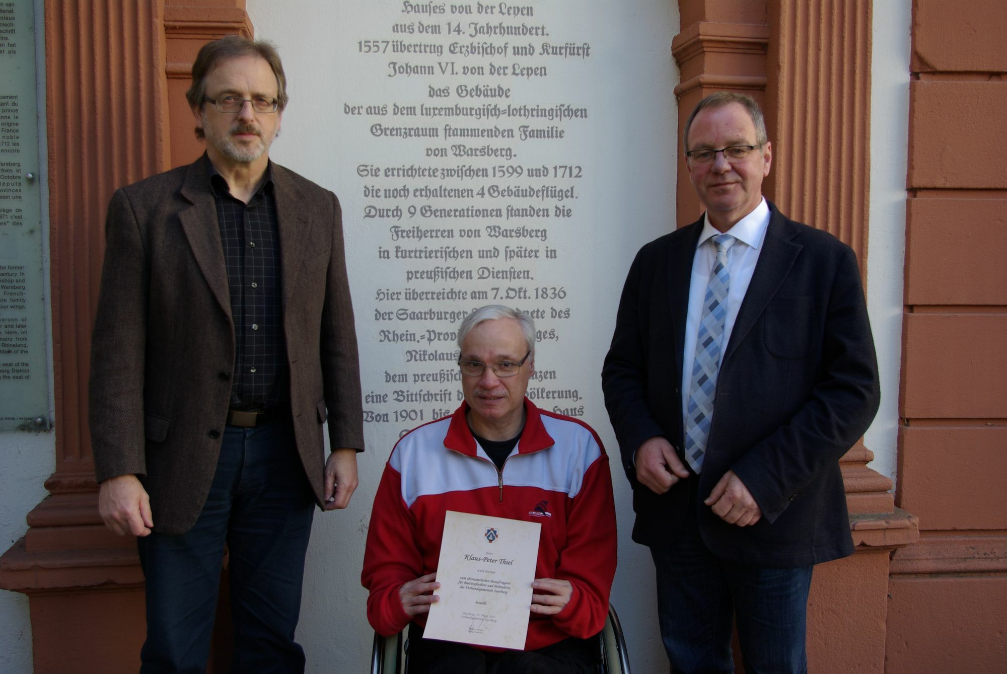 Klaus-Peter Thiel ist der erste ehrenamtliche Beauftragte für Barrierefreiheit und Behinderte der Verbandsgemeinde Saarburg. Eine entsprechende Urkunde überreichte ihm Bürgermeister Jürgen Dixius gemeinsam mit Büroleiter Rudolf Klein nun in der Verbandsgemeindewaltung.