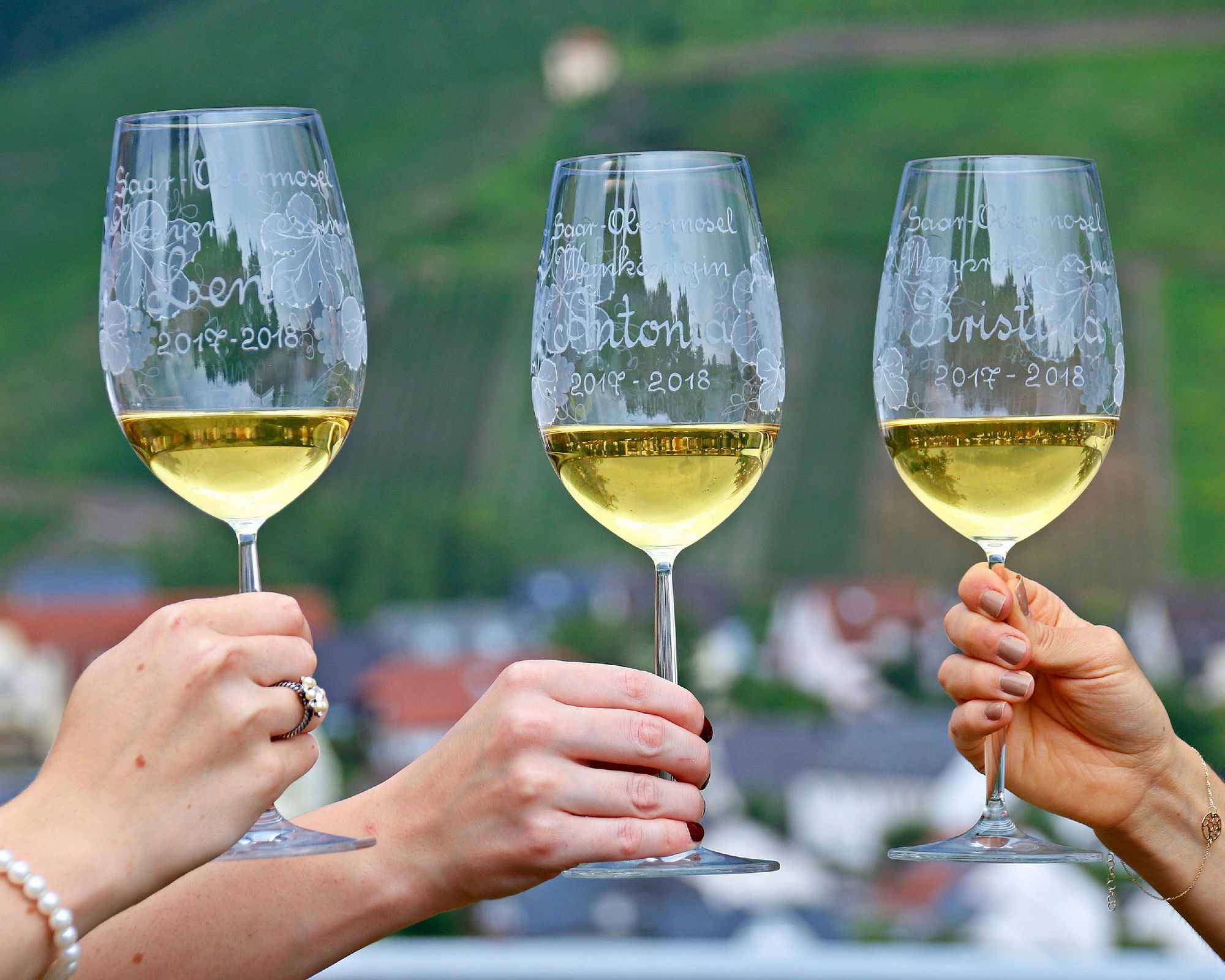 Die Weingläser der noch amtierenden Saar-Obermosel-Weinhoheiten. Im Rahmen des Saarweinfestes wird die neue Saar-Obermosel-Weinkönigin gekrönt. Foto: Elke Janssen