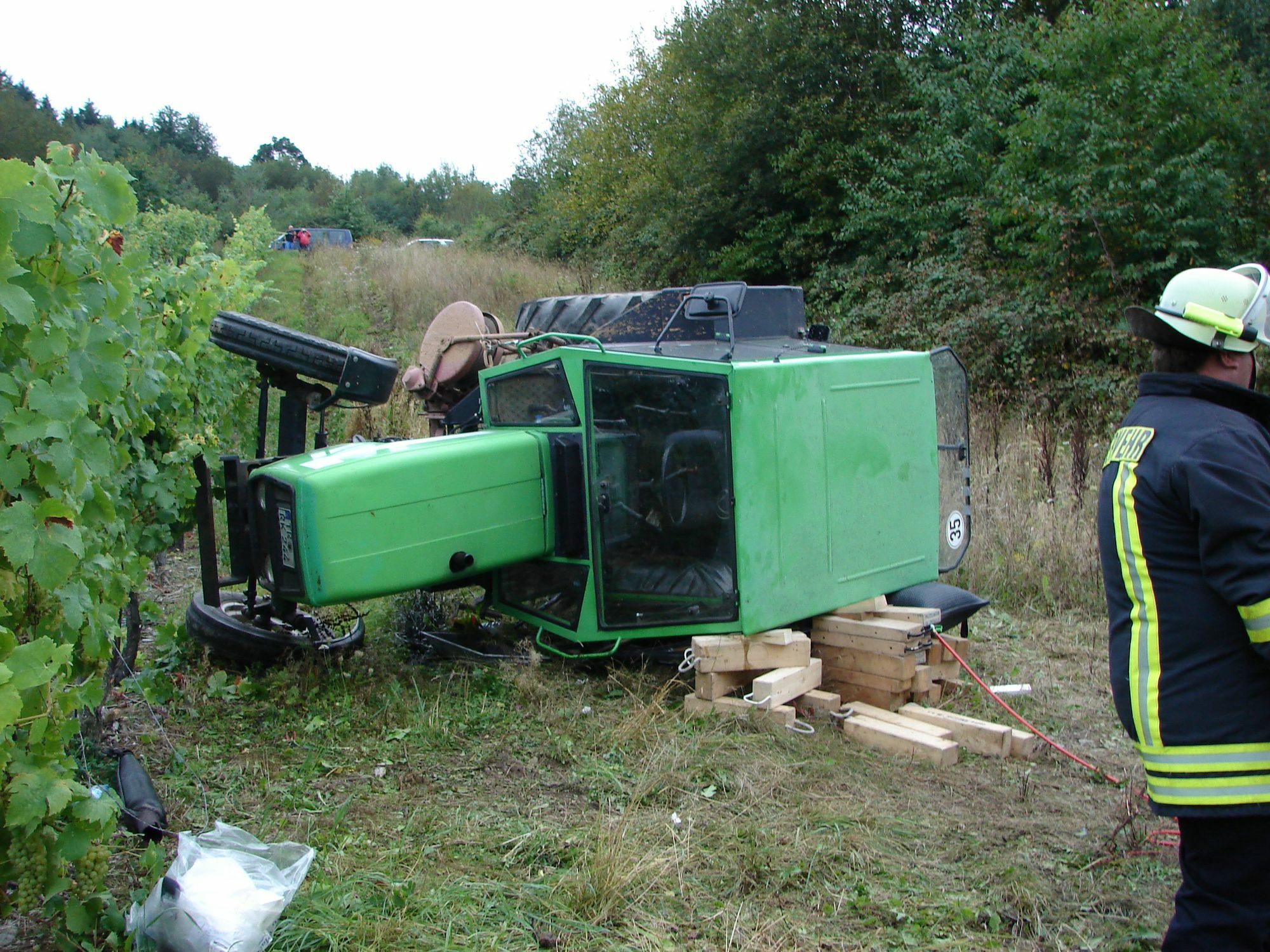 Vermutlich wegen überhöhter Geschwindigkeit und Unachtsamkeit kam die landwirtschaftliche Maschine ins Rutschen. Der Fahrer verlor die Kontrolle und der Traktor stürzte um. Dabei wurde der Fahrer eingeklemmt, der Beifahrer konnte sich retten und wurde leicht verletzt. Die alarmierte Feuerwehr rückte mit einem Rüstzug an, um den eingeklemmten zu befreien. Mit Spezialgerät wurde der Traktor angehoben. Der Fahrer konnte schließlich mit schweren Verletzungen befreit und gerettet werden. Nach notärztlicher Behandlung wurde dieser mit dem Rettungshubschrauber in ein Krankenhaus geflogen. Eine Einheit des Gefahrstoffzuges nahm nach der Rettung noch auslaufende Betriebsmittel auf. Der Schlepper wurde geborgen, es entstand hoher Sachschaden. Im Einsatz waren die Feuerwehren aus Leiwen, Klüsserath und Bekond, ebenso der Rüstzug der Feuerwehr Schweich. Zudem das DRK aus Schweich, ein Notarzt und der Rettungshubschrauber "Christoph 10" mit Notarzt und die Polizei.