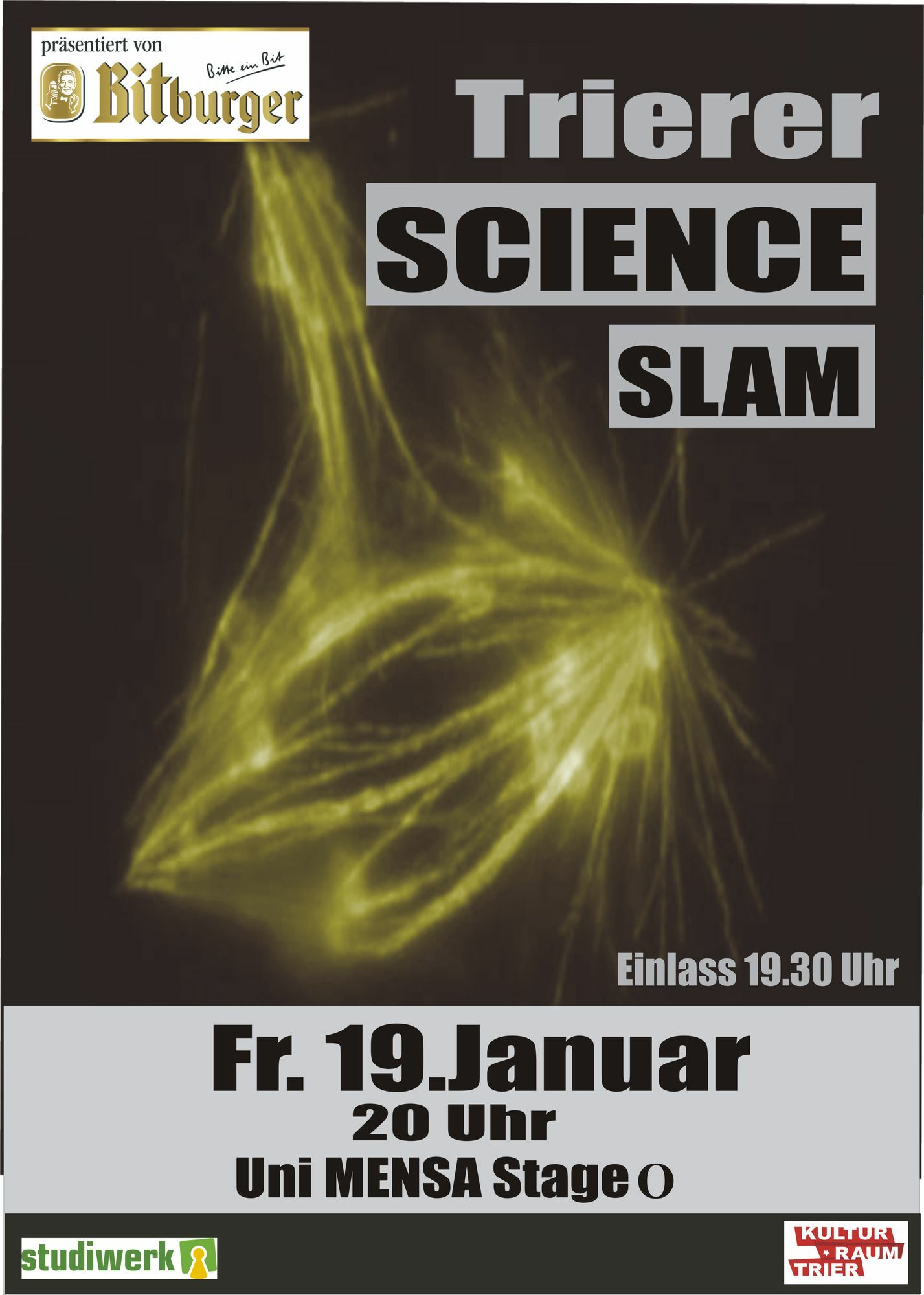 Obwohl sie sich noch nicht so etabliert haben wie die Poetry Slams, sind die ersten Science Slams fast genauso beliebt. Bei einem Science Slam werden allerdings keine selbstverfassten Kurzgeschichten zum Besten gegeben, sondern wissenschaftliche Themen und Arbeiten populärwissenschaftlich aufbereitet und den Zuhörern schmackhaft gemacht. Das Ganze erinnert dann an eine Mischung aus Ghetto Hip-Hop-Battle und Kolloquium. Mit Kurzvorträgen zu ihrer eigenen Forschung steigen Nachwuchswissenschaftler gegeneinander in den Ring. Dabei ist nicht die beste Forschung der Weg zum Sieg, sondern der beste Vortrag. Die Siegesehre gebührt dem, der mit Charme und Witz das Publikum am meisten von sich überzeugen kann. Und dabei tickt die Uhr, denn nur zehn Minuten stehen den Slammer zur Verfügung, um ihr Thema anschaulich einem bunt gemischten und meist fachfremden Publikum zu präsentieren. Es sind noch Startplätze zu vergeben. Laptop und sonstige Hilfsmittel sind erlaubt. Anmeldung unter: kultur@kulturraumtrier.de.