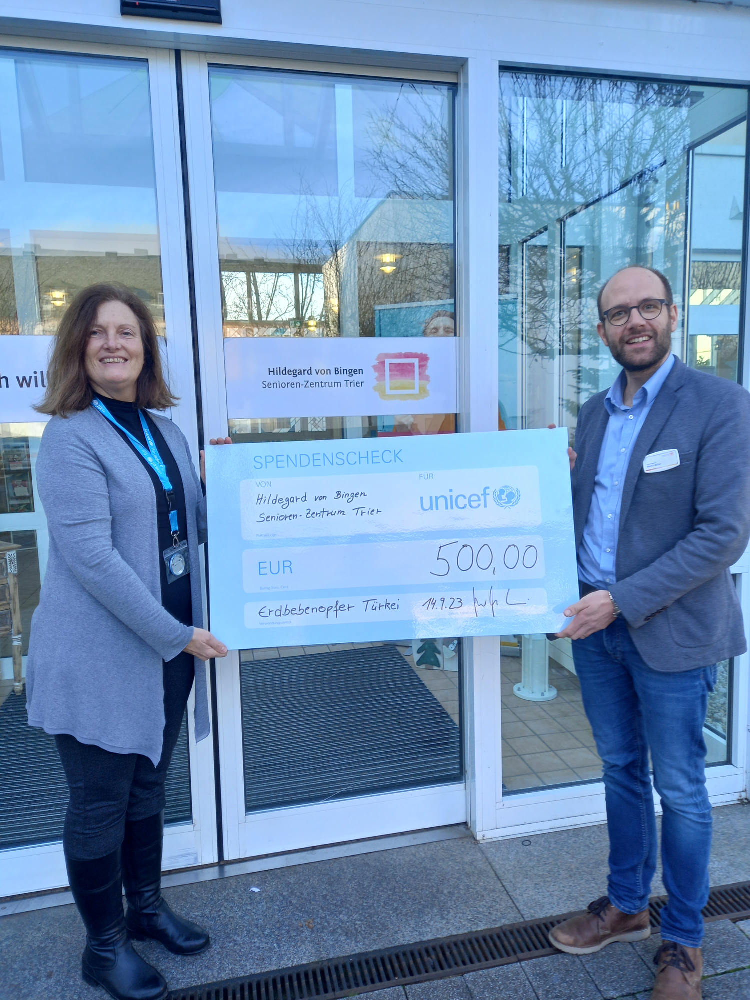 Für Ausgabe Trier Seniorenzentrum Hildegard von Bingen, Trier sammelt Spenden für Unicef Trier: Das Hildegard von Bingen Seniorenzentrum in Trier konnte ihre gesammelten Spenden von dem diesjährigen Sommerfest an eine Mitarbeiterin der Trierer Arbeitsgruppe von Unicef übergeben. Die Spendenübergabe konnte aus termingründen allerdings erst am 7. Dezember dieses Jahres erfolgen. Frau Gabi Willems, Unicef nahm den Spendenscheck von Herrn Martin Müller, Einrichtungsleitung des Seniorenzentrums Trier gerne entgegen.
