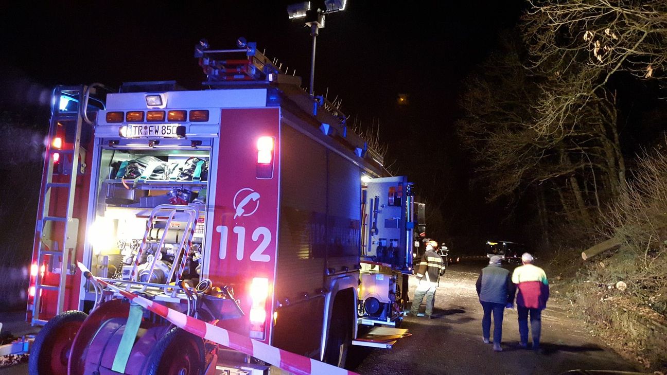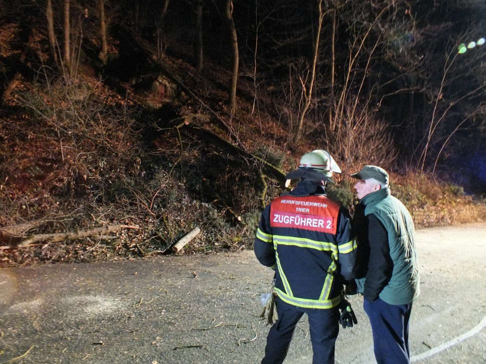 Die Bäume waren aufgrund der Witterung von einem privaten Waldgrundstück mitsamt der Wurzel auf die Straße gestürzt. Glück im Unglück hatte dabei ein Bus der Linie 12, der nach Ehrang unterwegs war: Die Bäume stürzten nur 30 Meter vor dem Bus auf die Straße und verfehlten ihn nur knapp. Die Feuerwehr schnitt den Weg wieder frei. Allerdings waren in dem Hang zwei weitere Bäume mitgerissen worden und hatten sich in anderen Baumkronen vergangen. Ein weiterer kräftiger Windstoß hätte laut dem Wehrleiter der Berufsfeuerwehr dazu geführt, dass auch diese Bäume auf die Straße gefallen wären. Die Straße war kurzzeitig gesperrt. Eine Spezialfirma wurde beauftragt, um die Stelle zu sichern. Gegen 20.45 Uhr wurde die Sperrung auf einer Spur kurzfristig aufgehoben. Die Bewohner "Der Bausch" konnten nach Hause fahren. Fotos: Agentur Siko
