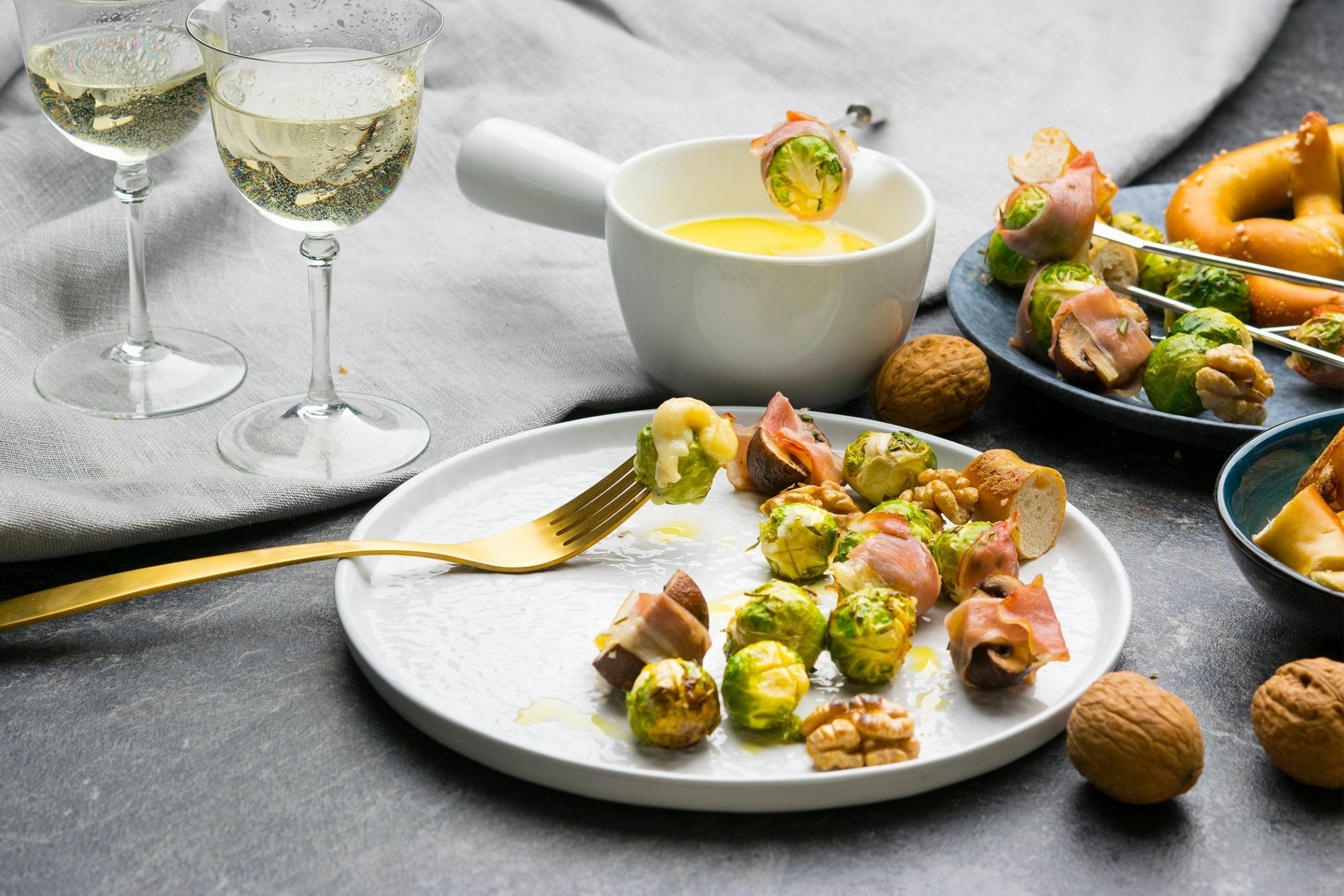 Idee für eine alternative Hauptspeise: Käse-Fondue mit Rosenkohl und Champignons. Dafür unbedingt eine Knoblauchzehe schälen und den Fondue-Topf damit einreiben. Das ist nicht nur für den Geschmack wichtig, sondern auch, damit sich der Käse nicht im Topf ablagert. Abwechslend mit dem vorbereiteten Gemüse (Rosenkohl im Backofen gegart, Pilze eventuell mit Schinkenstreifen umwickelt) können Brezelstücke in den Käse getunkt werden. Foto: BVEO/ Obst & Gemüse – 1000 gute Gründe