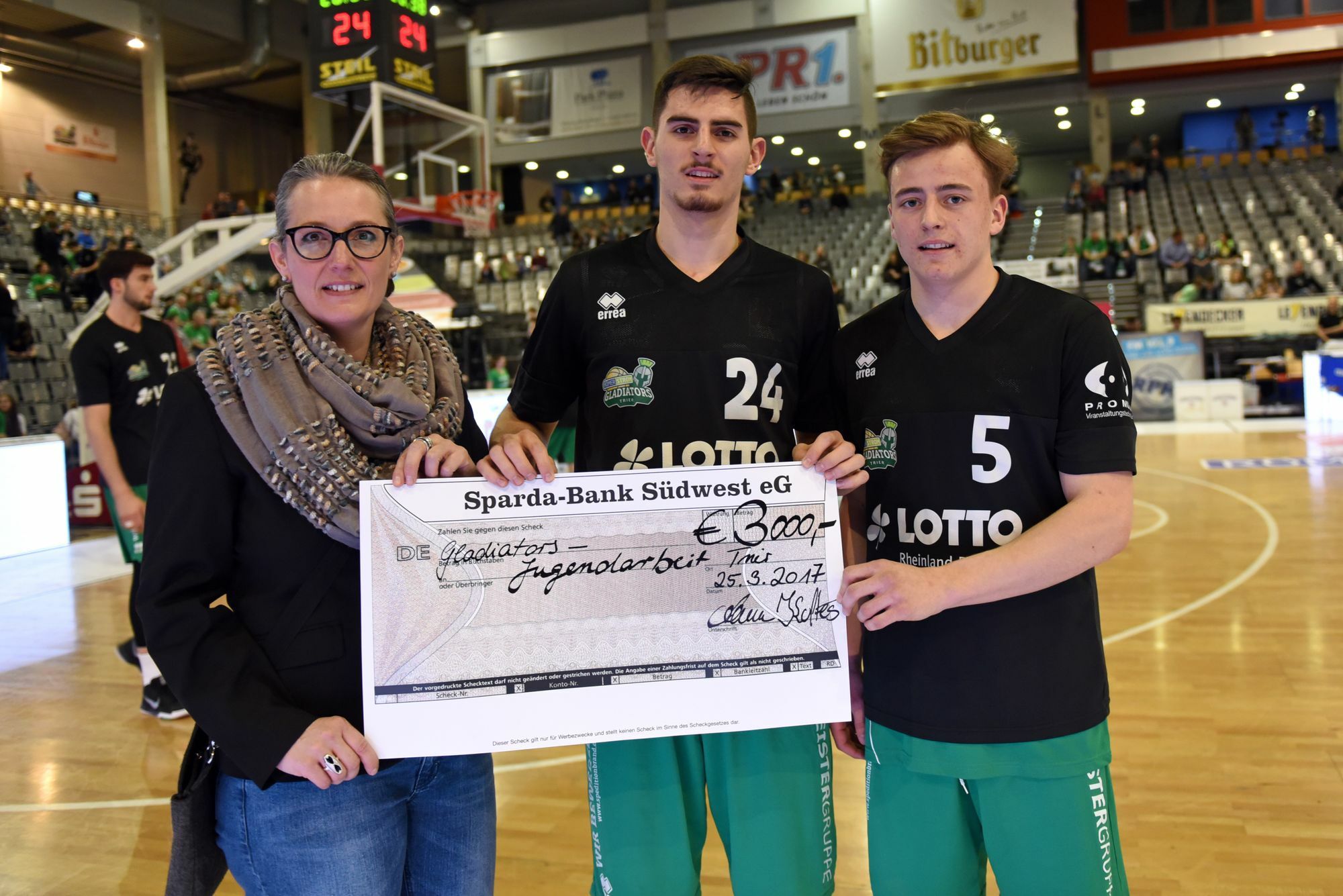Anja Assmann, Leiterin Filialvertrieb in der Gebietsdirektion Koblenz-Trier der Sparda-Bank Südwest, hatte kurz vor Tip-Off den Spendenscheck an Rupert Hennen und Sebastian Herrera, beide Spieler im Profi-Kader der Gladiators, übergeben. Das Geld stammt aus Mitteln des Gewinnsparvereins der Sparda-Bank Südwest . "Wir freuen uns riesig über die tolle Unterstützung und danken dem Sparda-Gewinnsparverein für die großzügige Spende, die wir in unsere Jugendarbeit investieren", erklärte Ruppert Hennen. "Die Förderung unserer jungen Spieler basiert auf dem INVICTUS-Konzept, das auf den drei Säulen Teamplay, Freundschaft und mentale Stärke aufbaut. Ziel ist es, dass durch die Verinnerlichung eines Zusammengehörigkeitsgefühls und des Fairplays, die Mannschaft als eine Einheit agiert, in der jeder Spieler für den jeweiligen anderen einsteht. Fehler und Entwicklungsgänge sollen dabei akzeptiert werden und eine gegenseitige Unterstützung soll stattfinden, sodass jeder Spieler sein Bestes geben kann", so Sebastian Herrera weiter.