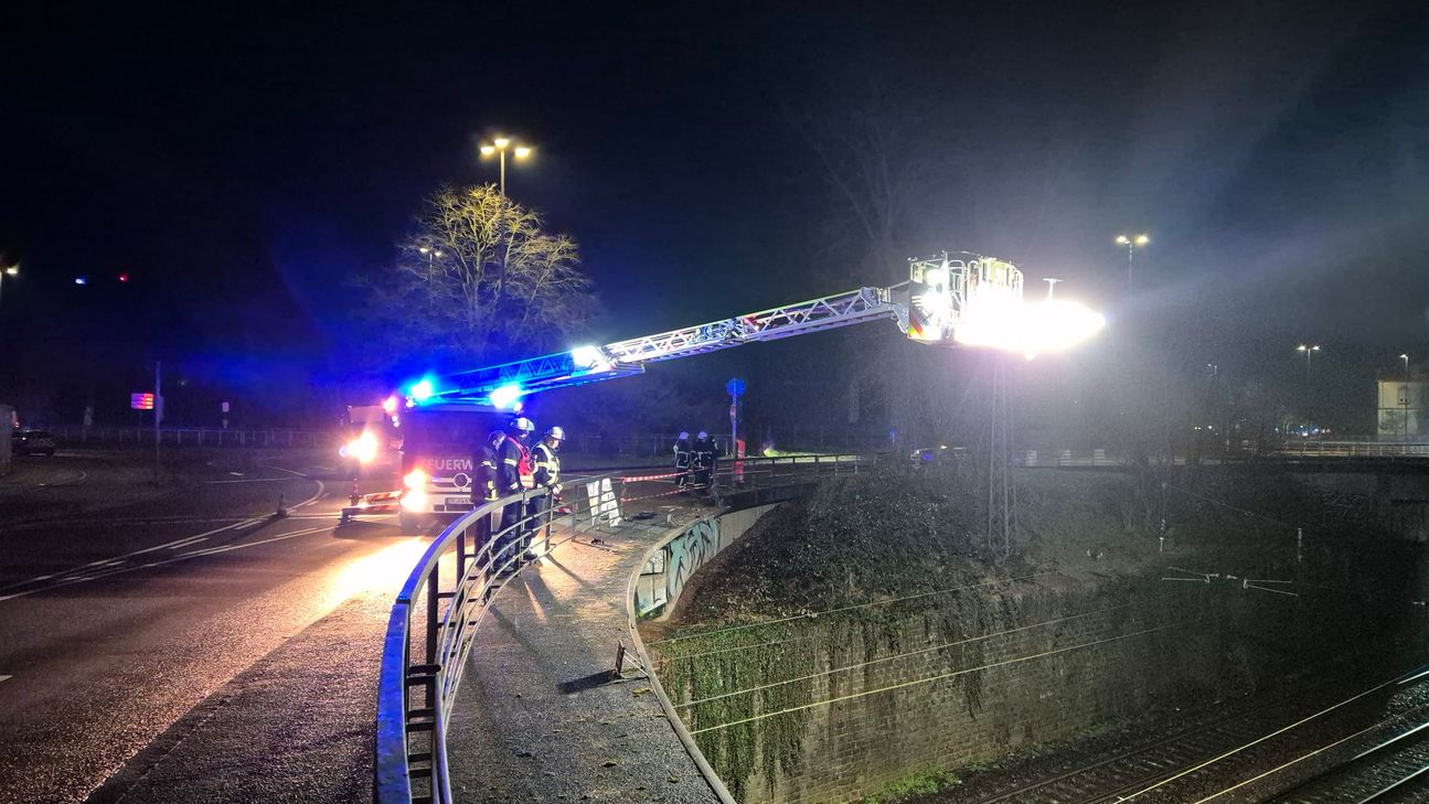 Nach ersten Erkenntnissen kam das Auto aus der Südallee, fuhr am Kreisverkehr geradeaus weiter, durchbrach das Geländer und flog ungebremst in Richtung Bahngleise. Das Fahrzeug landete auf dem Dach und wurde dabei schwer beschädigt. Der Fahrer hatte großes Glück.