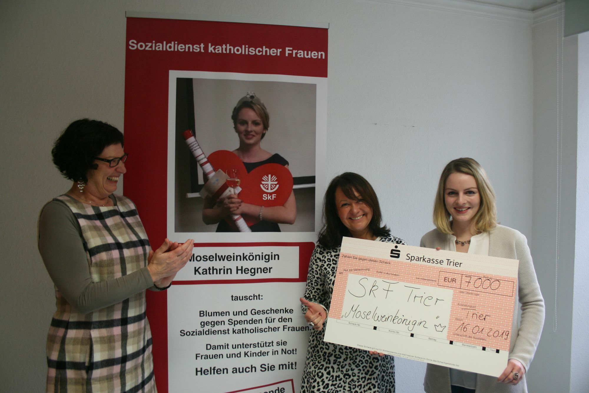 So kamen von ihrer Krönung im September 2017 bis zur Wahl ihrer Nachfolgerin im September 2018 fast 6.600 Euro an Spenden zusammen. Kathrin Hegner stockte den Betrag aus eigener Tasche auf und überreichte nun einen Scheck über 7.000 Euro an den Sozialdienst Katholischer Frauen in Trier. Das Geld kommt Müttern und Kindern in Notlagen zu Gute, die vom SKF in Trier betreut und versorgt werden.