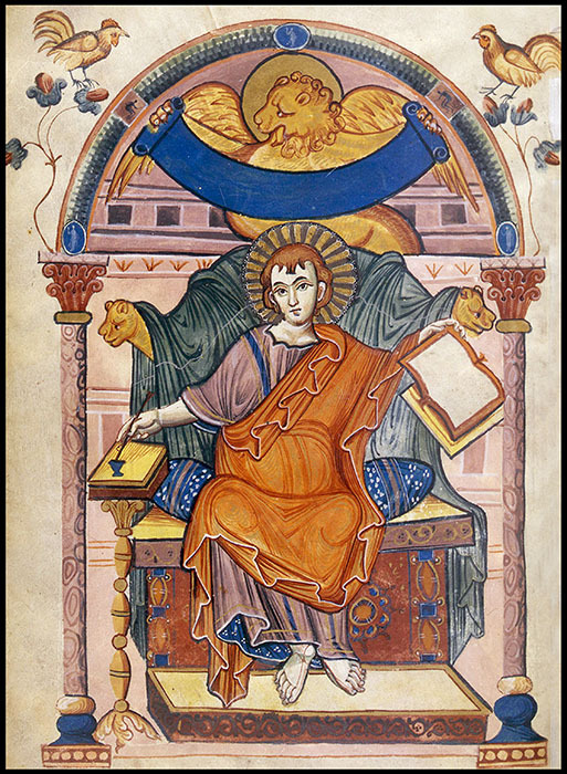 Auf einer Seite der Ada-Handschrift ist der Evangelist Markus mit der Heiligen Schrift zu sehen. Foto: Stadtbibliothek