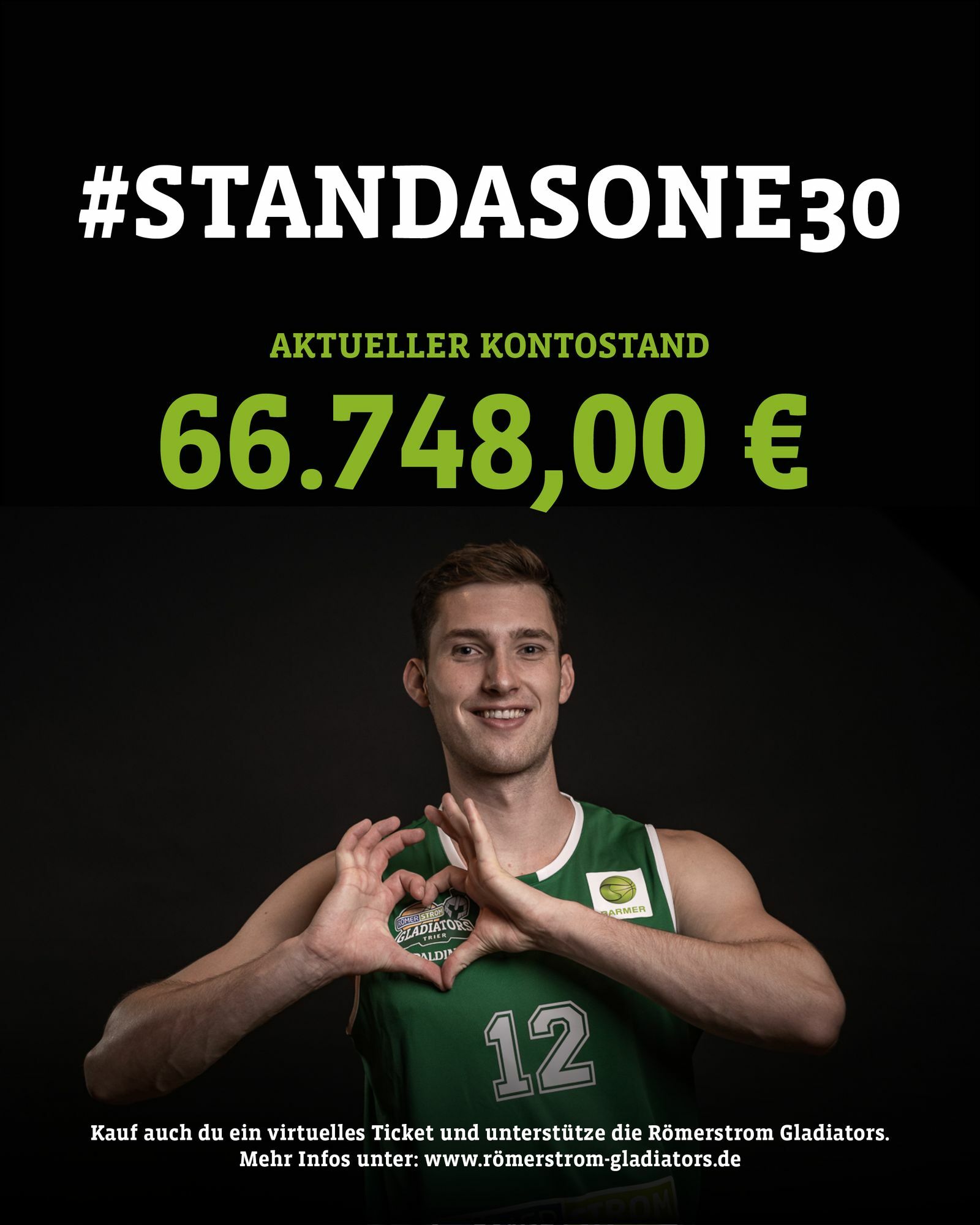 66.748,00 Euro – die RÖMERSTROM Gladiators Trier sind gut unterwegs mit ihrer Spendenaktion #StandAsOne30, die einen Teil zur Rettung des aufgrund der Corona-Pandemie finanziell angeschlagenen Vereins beitragen soll. 120.000 Euro sind die Zielmarke, die auf dem Treuhand-Spendenkonto des Klubs zusammenkommen soll. "Absolut beeindruckend, was unsere Fans in diesen ersten Wochen der Aktion an Einsatz gezeigt haben und wie viel Geld bereits zusammengekommen ist. Wir sind extrem dankbar für diese Unterstützung", sagt Andre Ewertz, Geschäftsführer der Gladiators Trier.
