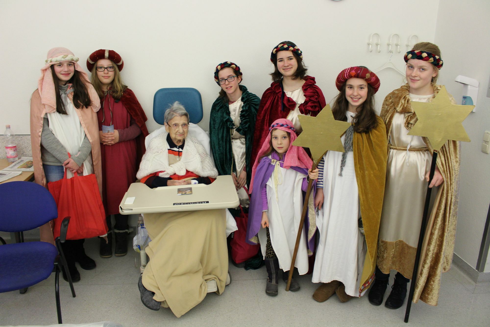 In diesem Jahr gab es auch für die Sternsinger eine besondere Begegnung, als sie der 100-jährigen Triererin Johanna Goerres ihre Lieder vortragen durften. Die alte Dame ist zur Zeit zu einer stationären Behandlung im Brüderkrankenhaus und freute sich besonders über die musikalische Unterhaltung und den Segen.