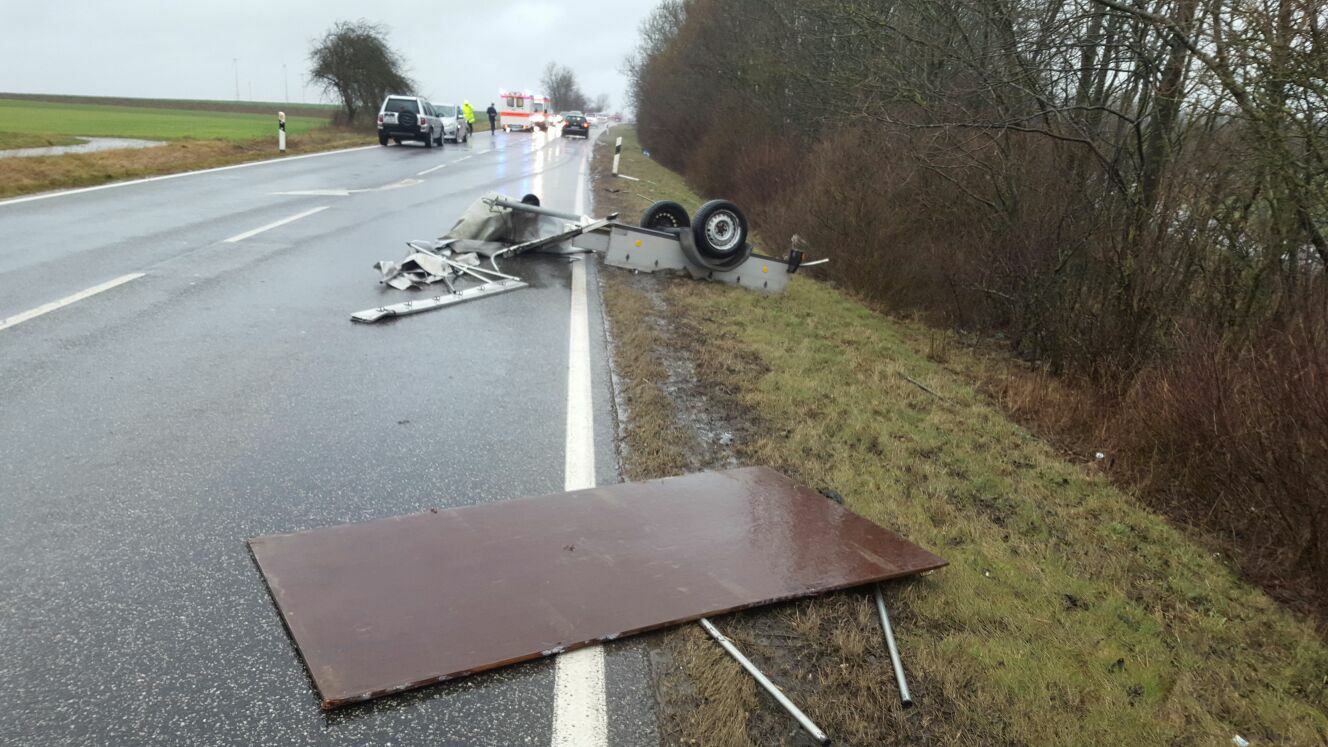 Durch eine starke Windböe wurde der Anhänger eines Auto auf der L 151 erfasst. Der Anhänger wurde von der Kupplung abgerissen und durch die Luft geschleudert. Er krachte dabei gegen das entgegenkommende Auto einer 53-Jährigen. Das Auto der Frau landete im Straßengraben. Die 53-Jährige und ihre Beifahrerin wurden leicht verletzt. An dem Fahrzeug entstand Totalschaden (12.000 Euro). Für die Bergung musste die L 151 zeiweise gesperrt werden. Es kam es zu erheblichen Verkehrsbehinderungen. Im Einsatz war das DRK aus Hermeskeil, Schweich und Ehrang mit Notarzt sowie die Polizei. Fotos: Agentur Siko