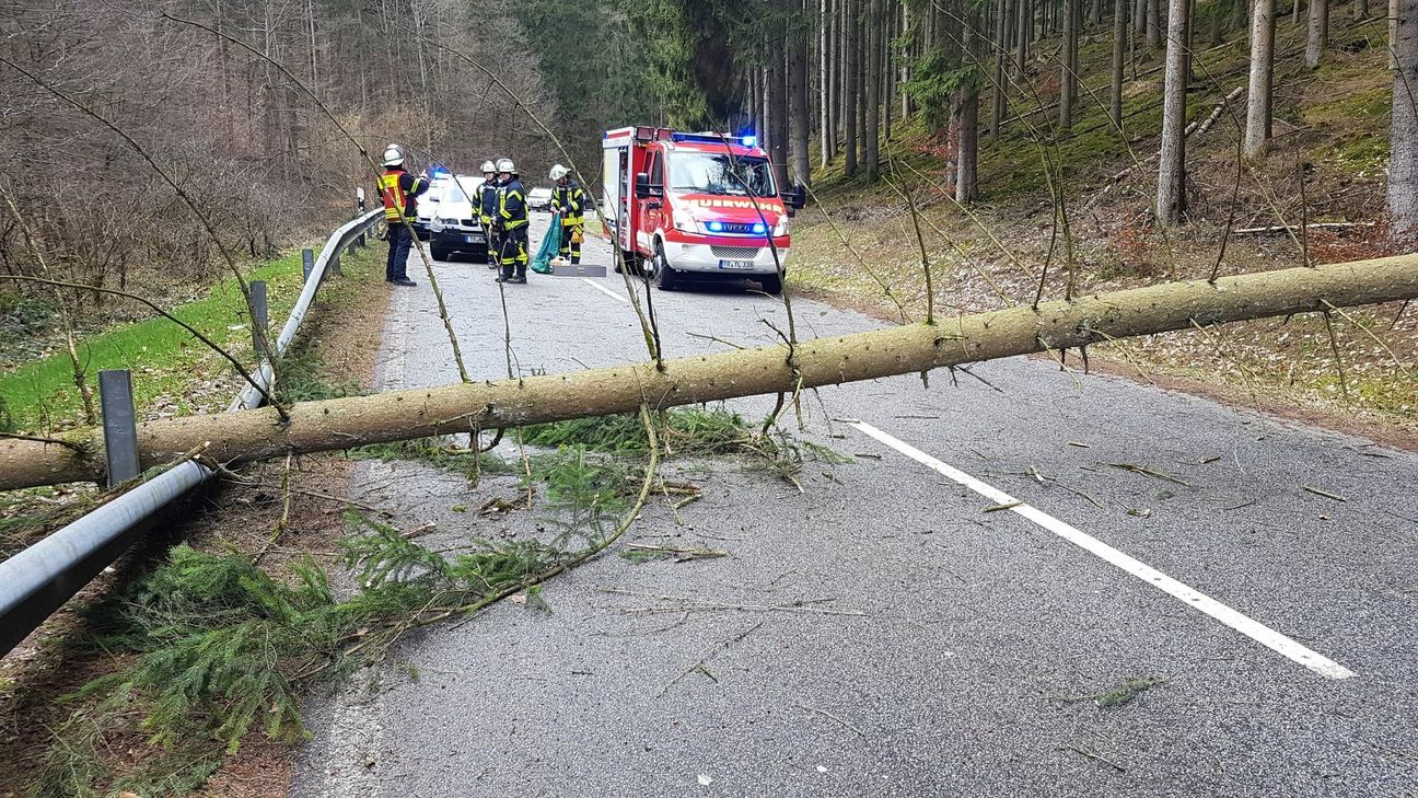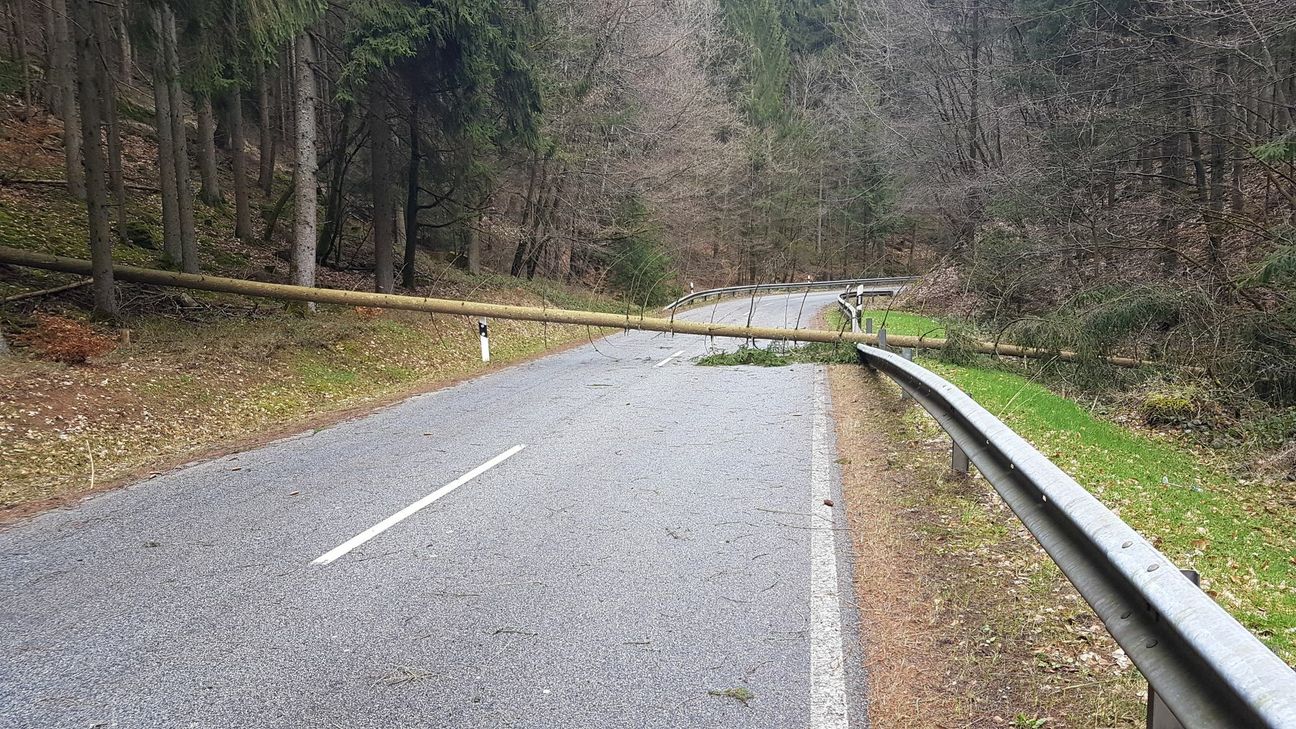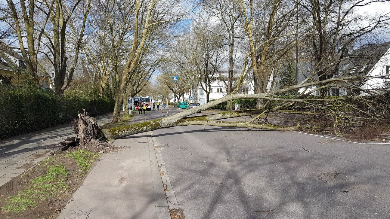 Durch zum Teil heftige Sturmböen wurden acht Bäume entwurzelt und fielen ohne weiteren Schaden anzurichten auf die Fahrbahn. Etliche Äste brachen ab und verteilten sich auf den Straßen. Mehrere Baustellenbeschilderungen oder Absicherungen wurden umgeweht und landeten auf der Fahrbahn. Insgesamt kam es zu drei Verkehrsunfällen, bei dem jeweils während der Fahrt ein Baum auf einen PKW fiel. Verletzt wurde niemand. Einmal wurde ein ungesicherter Müllcontainer auf die Fahrbahn geblasen und kollidierte dort mit einem Auto. Bei den Unfällen kam es zu Schäden in Höhe von insgesamt circa 5.000 Euro. Vier Bäume fielen auf parkende Fahrzeuge. Hier kam es zu Schäden in Höhe von circa 10.000 Euro. Ein Roller wurde umgeweht und schleuderte gegen einen parkenden PKW. Der Schaden beträgt circa 1.000 Euro.