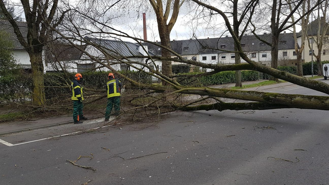 Schwere Sturmböen brachten einen Kamin in der Maarstraße zum Einsturz, der auf ein Haus stürzte. Die Feuerwehr trug den Kamin ab. In der Brotstraße drohte ebenfalls ein Kamin umzustürzen und wurde vorsorglich abgebaut. Glück im Unglück hatte ein Autofahrer, der zwischen Zewen und Igel unterwegs war, sein Auto wurde von einem umstürzenden Baum gestreift, der Fahrer blieb unverletzt. In Kürenz kippte ein Baum in eine Stromleitung. Ein Fußgänger wurde in der Straße "An der Meerkatz" in Trier durch ein umgewehtes Verkehrszeichen am Rücken getroffen. Der Mann wurde nur leicht verletzt. In der Karthäuser Straße lösten sich Dachplatten an einem Gebäude, sodass aus Sicherheitsgründen bis zur Behebung der Gefahrenstelle die Straße komplett gesperrt bleibt.Auch Freiwillige Wehren im Einsatz