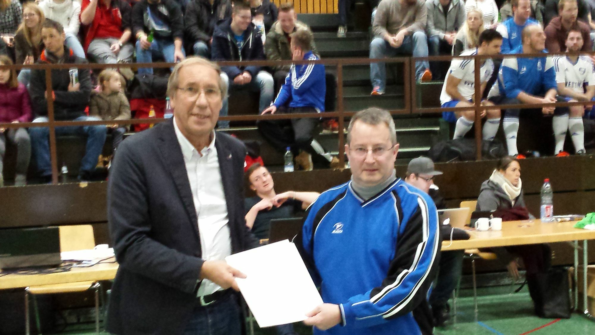 Im Rahmen des Veltins-Cups übergab Norbert Neuser (im Bild links), Vizepräsident des Fußballverbandes Rheinland für sozial- und gesellschaftspolitische Aufgaben an SVLK-Vorsitzenden Werner Jostock (rechts) einen Scheck über 500 Euro - und dankte damit auch im Namen der Egidius-Braun-Stiftung für das Engagement des Vereins, was die Integration von Flüchtlingen angeht. Nach Angaben von Jostock besitzen aktuell je fünf von ihnen eine Spielberechtigung für die Senioren und für die Jugend. Auch gemeinsame Freizeitaktivitäten finden unter der Regie des Sportvereins statt. In Kürze will man auch einen speziellen Kurs "Fußballdeutsch" für die Flüchtlinge anbieten.AA