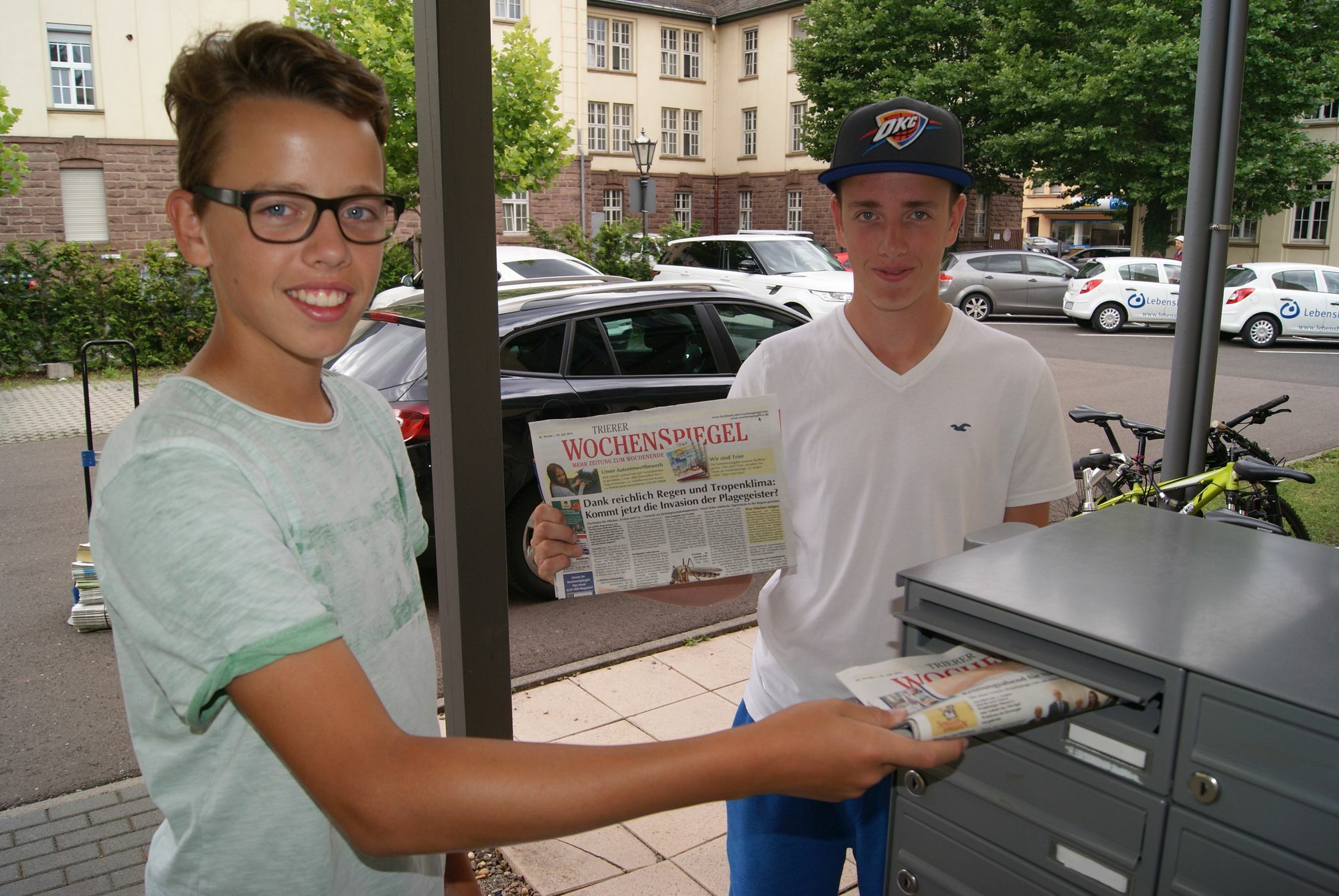 Immer freitags ist WochenSpiegel-Zeit. Dann nämlich landet die druckfrische Ausgabe mit vielen Informationen, aktuellen Veranstaltungstipps und attraktiven Angeboten in den Briefkästen der Leser. Damit dies funktioniert, sind im Verbreitungsgebiet Woche für Woche zahlreiche fleißige Zusteller unterwegs, die sich dadurch ihr Taschengeld oder das Einkommen aufbessern. Dabei ist dieser Job leichter als gedacht und der Verdienst höher als vermutet – finden auch Julius und Leonhard aus Trier.