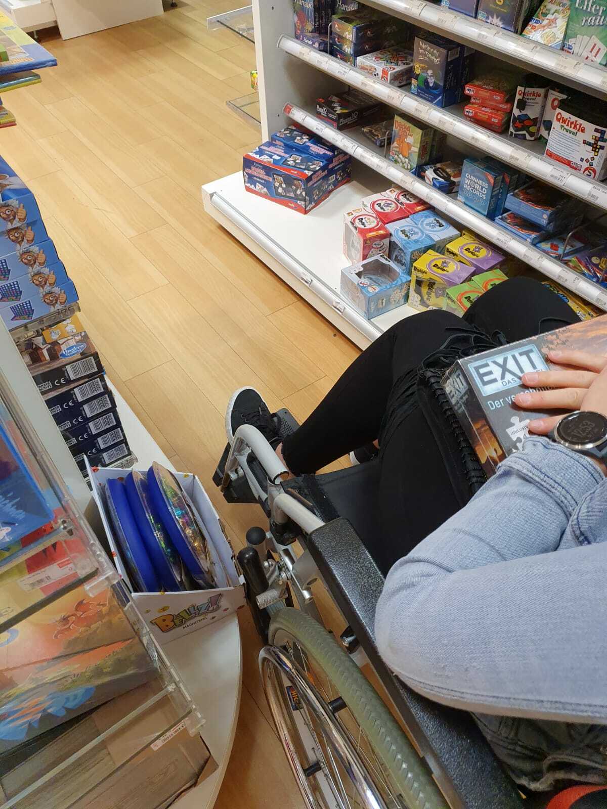 Auf der einen Seite sind viele Geschäfte und Gastronomiebetreibe im Zugang barrierefrei und verfügen auch über Aufzüge, auf der anderen Seite ist die Gestaltung des Innenraums nicht unbedingt auf Rollstuhlfahrer ausgelegt. Somit ist Rollstuhlfahrern der Zugang zu vielen Geschäften nicht möglich und führt dazu, dass sie in ihrer Auswahl sehr eingeschränkt werden. Häufig stellen enge Gänge und hohe Regale oder Kassen ein Hindernis dar. Dadurch wird die Selbstständigkeit im Alltag nicht nur erschwert, sondern teilweise auch ganz verhindert. Die Betroffenen können bei zu hohen Regalen beispielsweise nicht unabhängig handeln und sind entweder auf eine helfende Person oder auf ein weiteres Hilfsmittel angewiesen. Die Erfahrung der Schüler hat gezeigt, dass es kein schönes Gefühl ist,