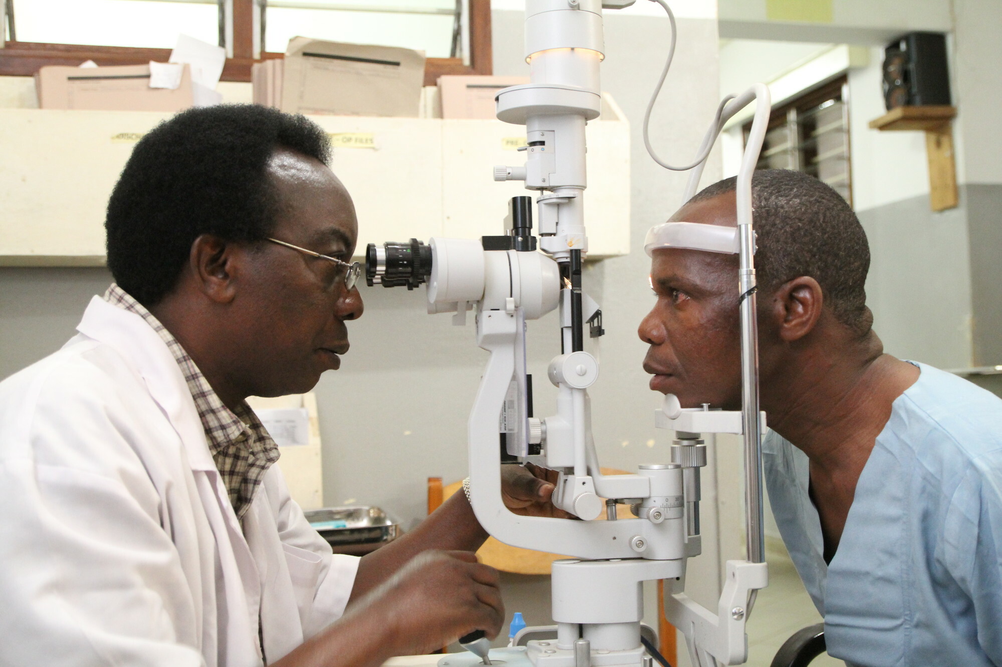 Die Nachuntersuchung bestätigt es, Mazaga Mahorosho (r.) wurde erfolgreich am Grauen Star operiert. Foto: Aretz/CBM