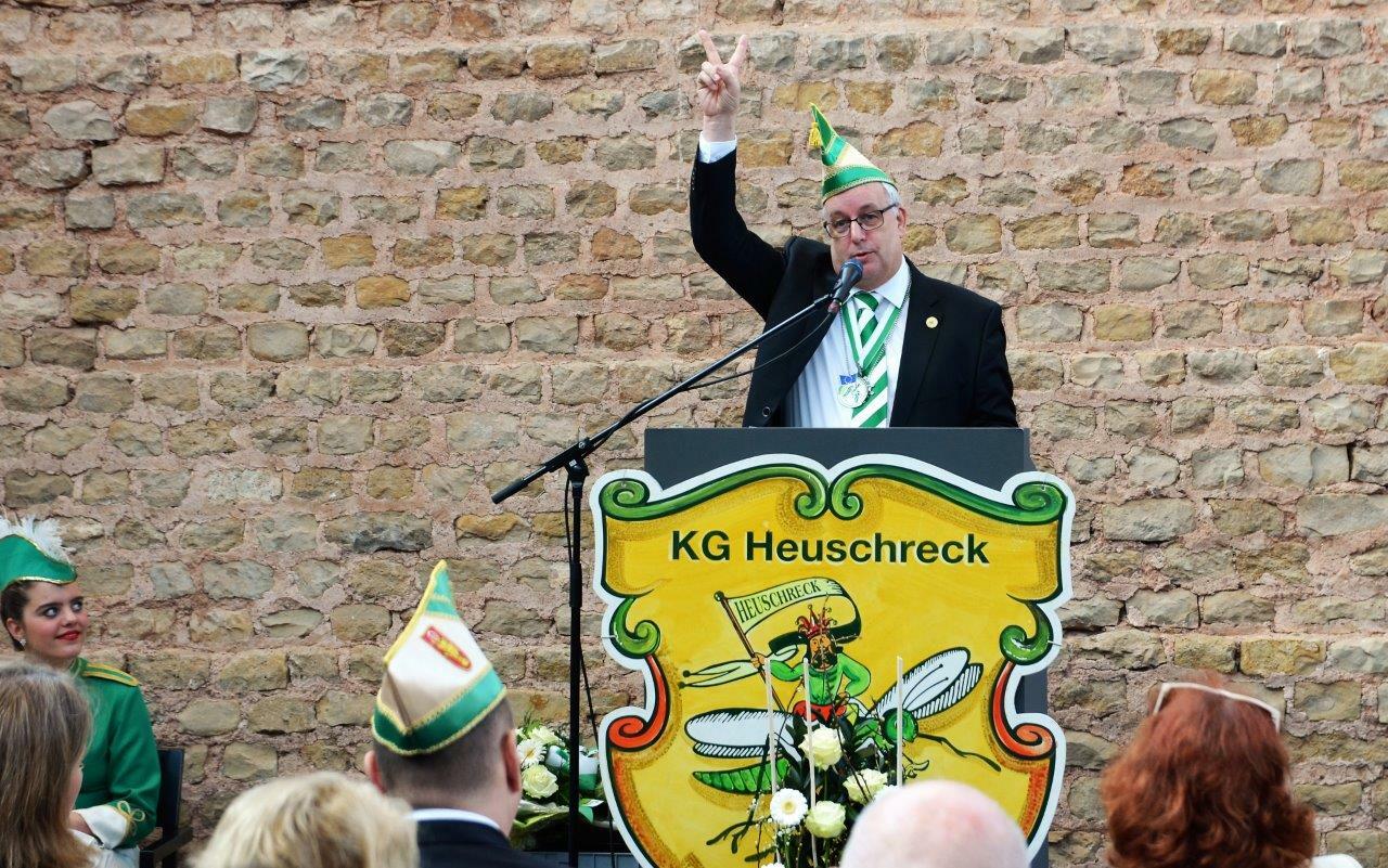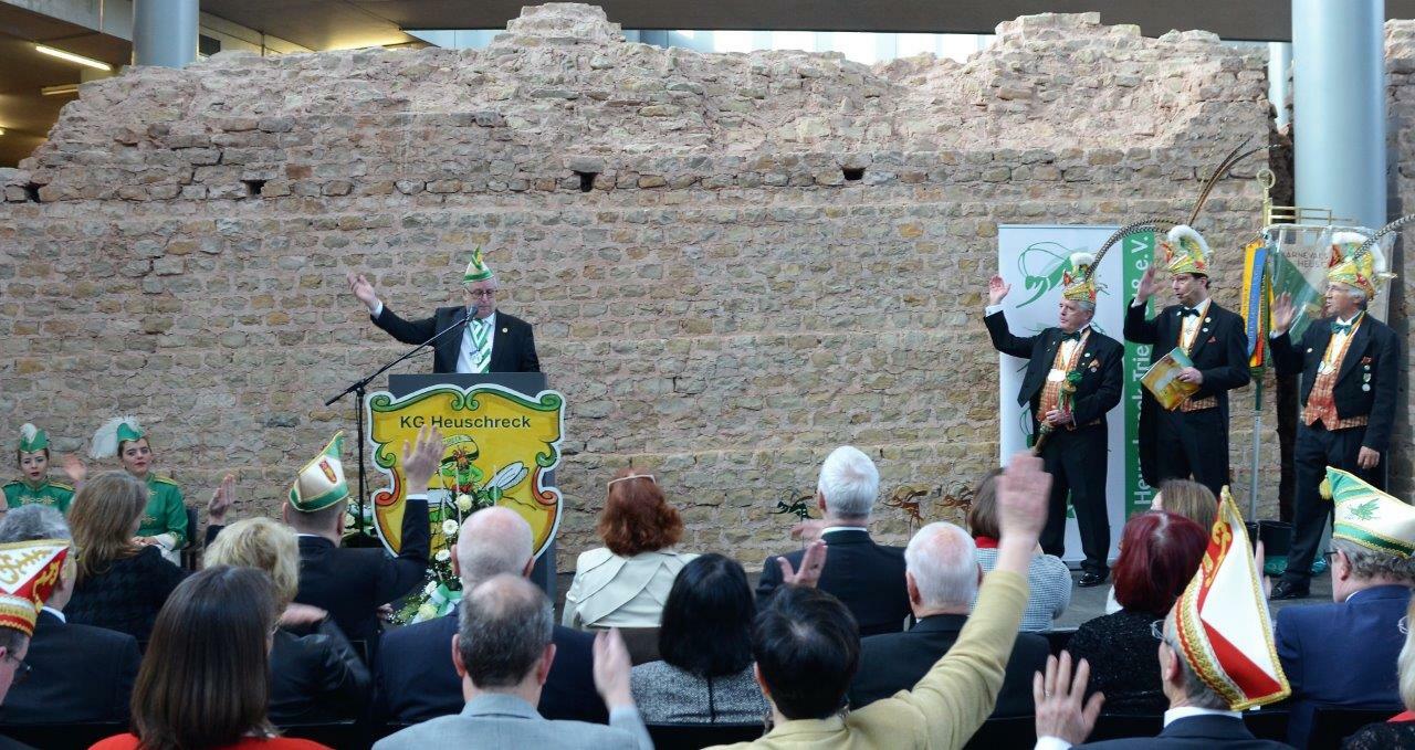 Ganz im Zeichen des diesjährigen Sessions-Mottos „HEUropa – Revolution der Narren“ veranstaltete die KG Heuschreck 1848 ihr Ordensfest erstmals in den Trierer Viehmarktthermen. Über 200 Karnevalisten und Honoratioren aus Politik und Wirtschaft ließen es sich nicht nehmen am Sonntagvormittag das 170-jährige Bestehen von Triers ältester Karnevalsgesellschaft gebührend zu feiern und erhielten den Sessionsorden, der vom Trierer Baudezernenten und Senator der Gesellschaft, Andreas Ludwig vorgestellt wurde. Im Rahmen der Veranstaltung wurde der ausgeschiedene Präsident Dr. Harald Reusch zum Ehrenpräsidenten der Gesellschaft ernannt. Weitere Ehrungen an lang verdiente Mitglieder gingen an: Gerhard Kress, Edith Bretz, Willi Morbach und Hanne König.