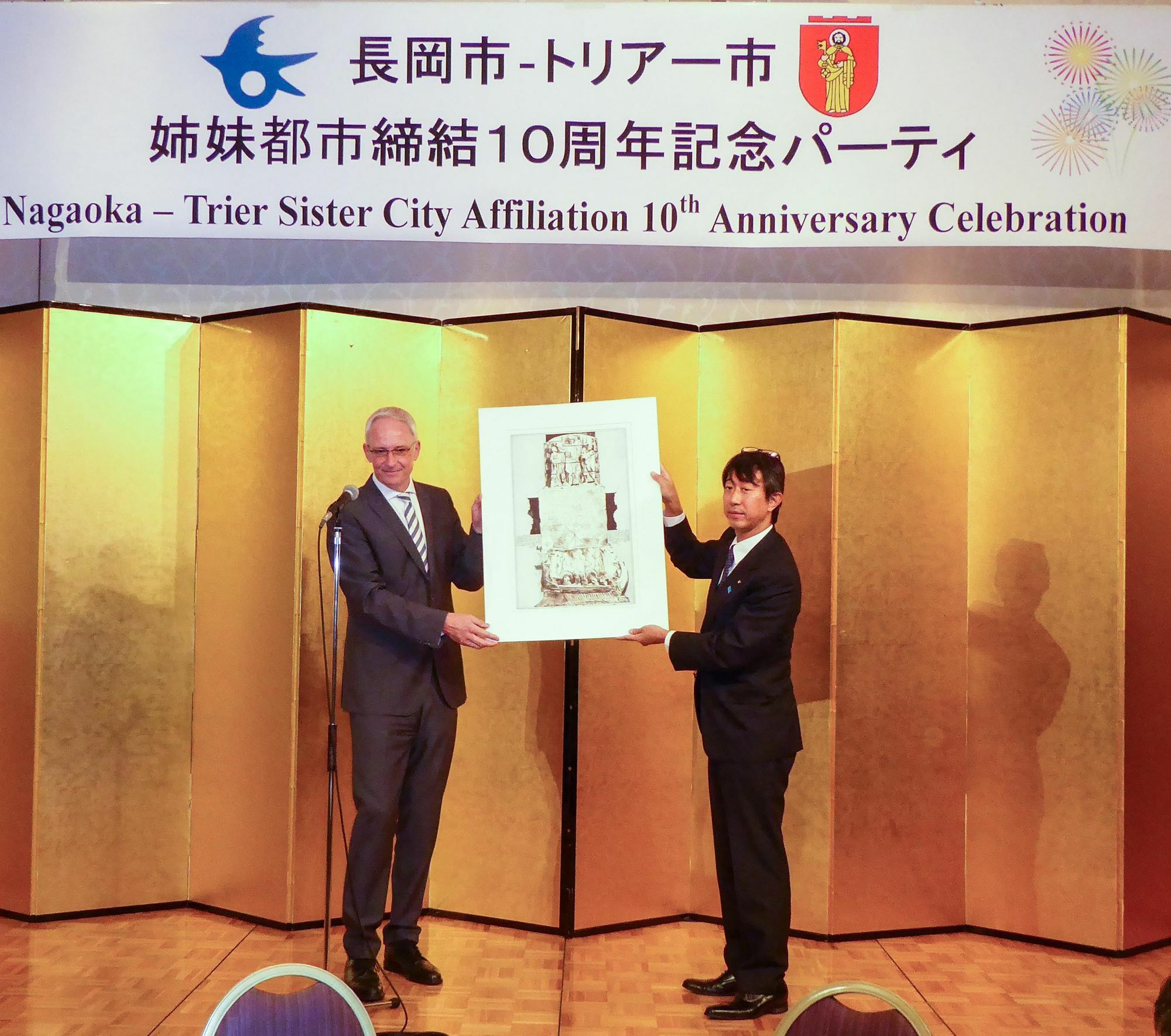 Neben Wada, OB Leibe und Bürgermeister Takami nahmen auch Ratspräsident Masashi Seki, Tourismusdirketor Hiroyuki Hirose und der Präsident der Nagaoka International Exchange Association, Kazuhiko Hara, sowie auf Trierer Seite Johann Aubart, Präsident der Deutsch-Japanischen Gesellschaft, an der Jubiläumszeremonie teil. Das Festprogramm wurde unter anderem von der Porta-Nigra-Schule Trier sowie Austauschschülern aus Nagaoka, die im vergangenen Jahr Trier besucht hatten, gestaltet. Der Trierer Tenor Thomas Kiessling gab zur Freude der Gastgeber einige Kostproben aus seinem Repertoire.