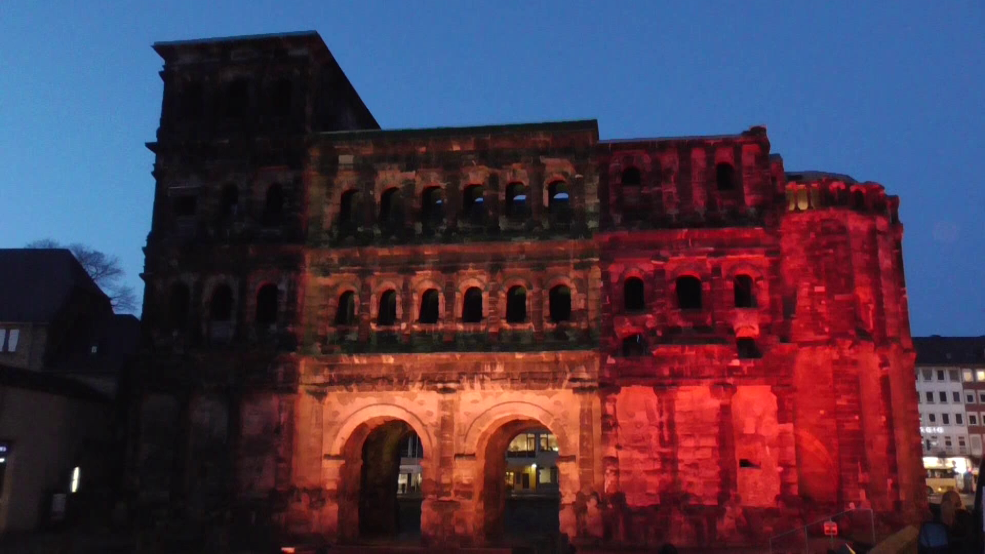 Am Karfreitagabend, 25. März, erstrahlte die Porta Nigra in Trier um 19 Uhr aus Solidarität in den Landesfarben von Belgien in schwarz-gelb-rot.