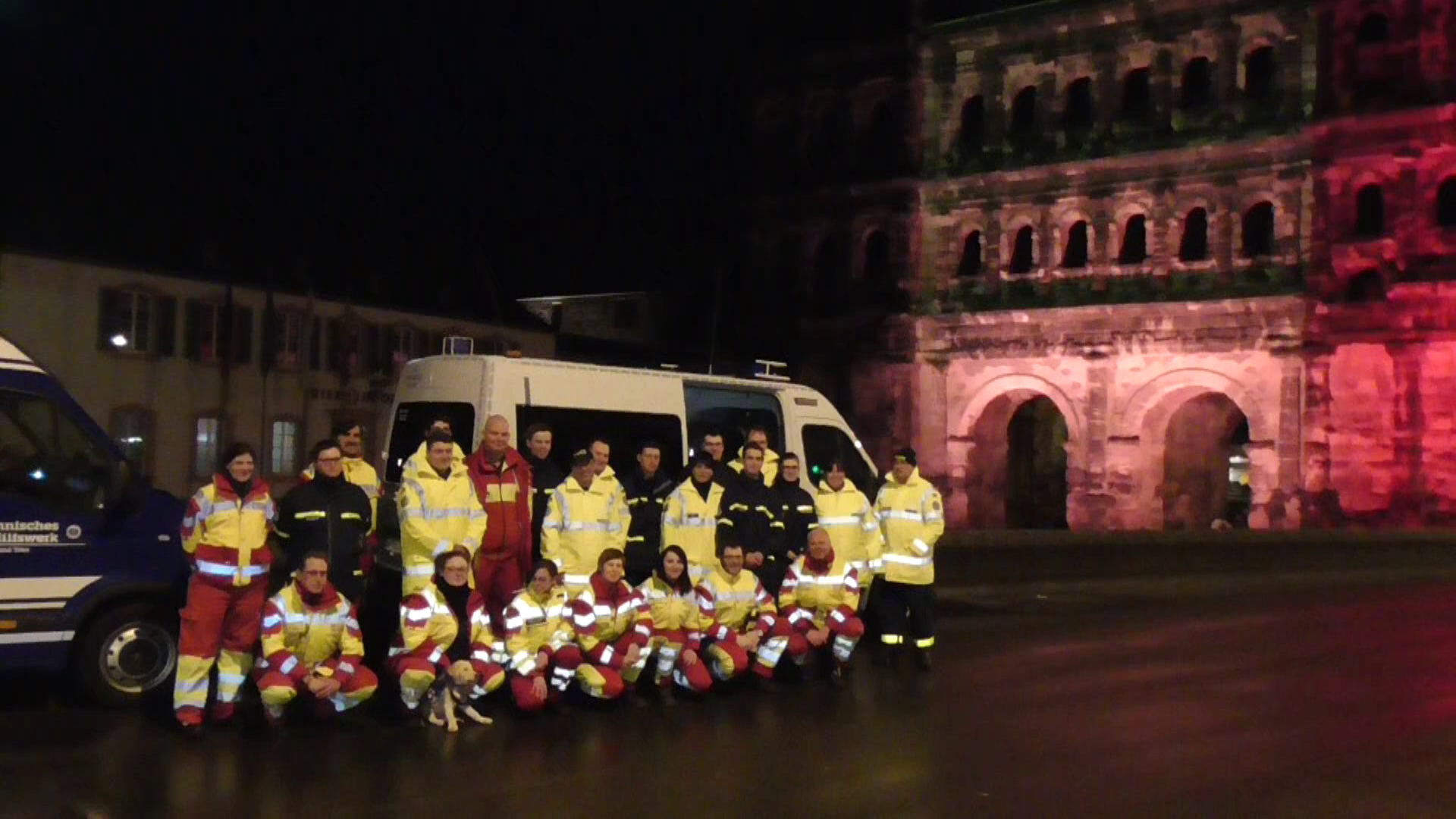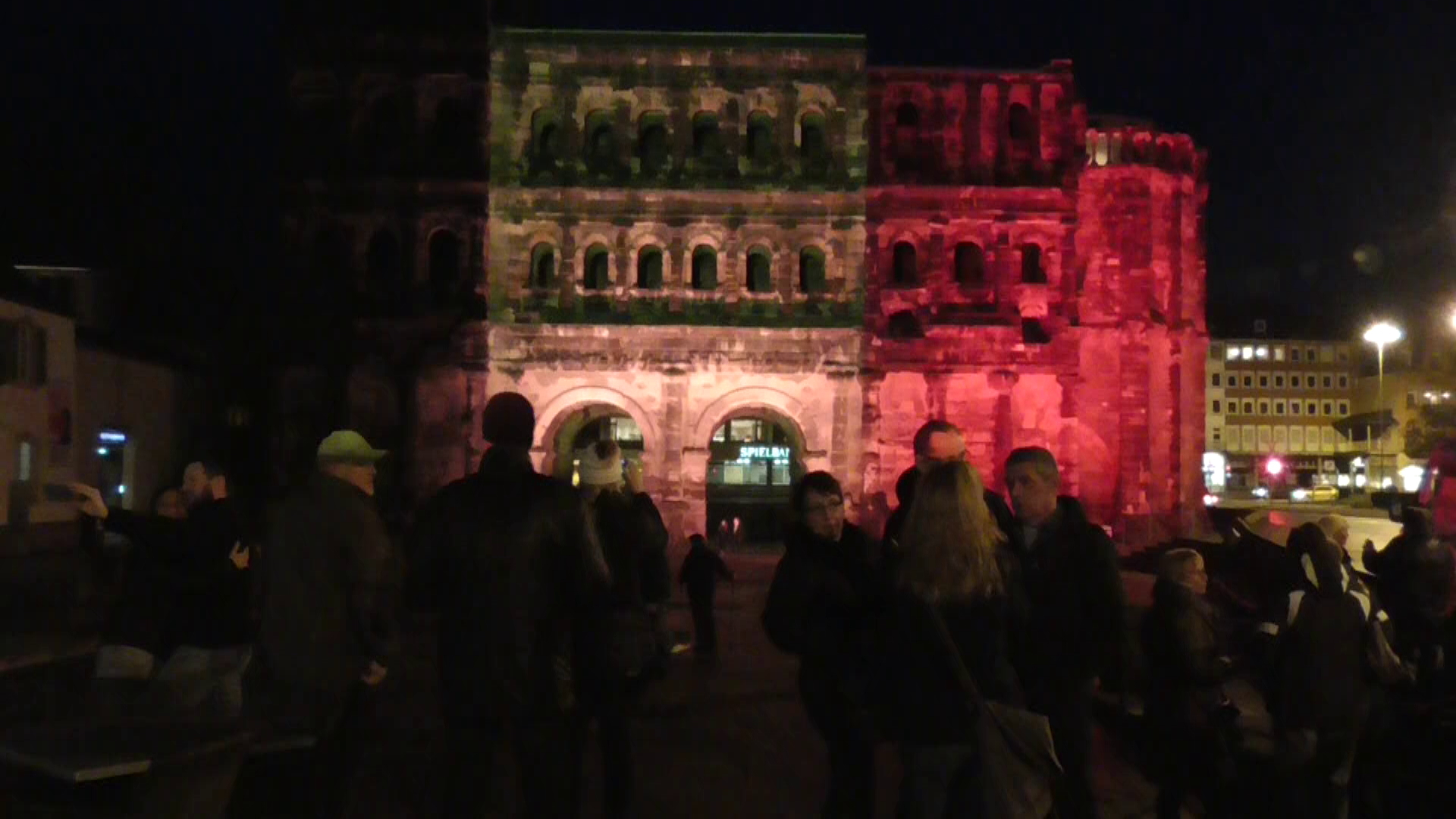 Einsatzkräfte des ASB Trier und der THW Trier kamen in großer Mannschaftsstärke zur Porta Nigra und zeigten sich solidarisch. "Wir denken auch an die hunderte Rettungskräfte bei solchen Terroranschlägen die alles geben um Leben zu retten", so ein Sprecher des THW. Die Lichtinstallation war von 19 Uhr bis 22 Uhr auf der Porta Nigra zu sehen.