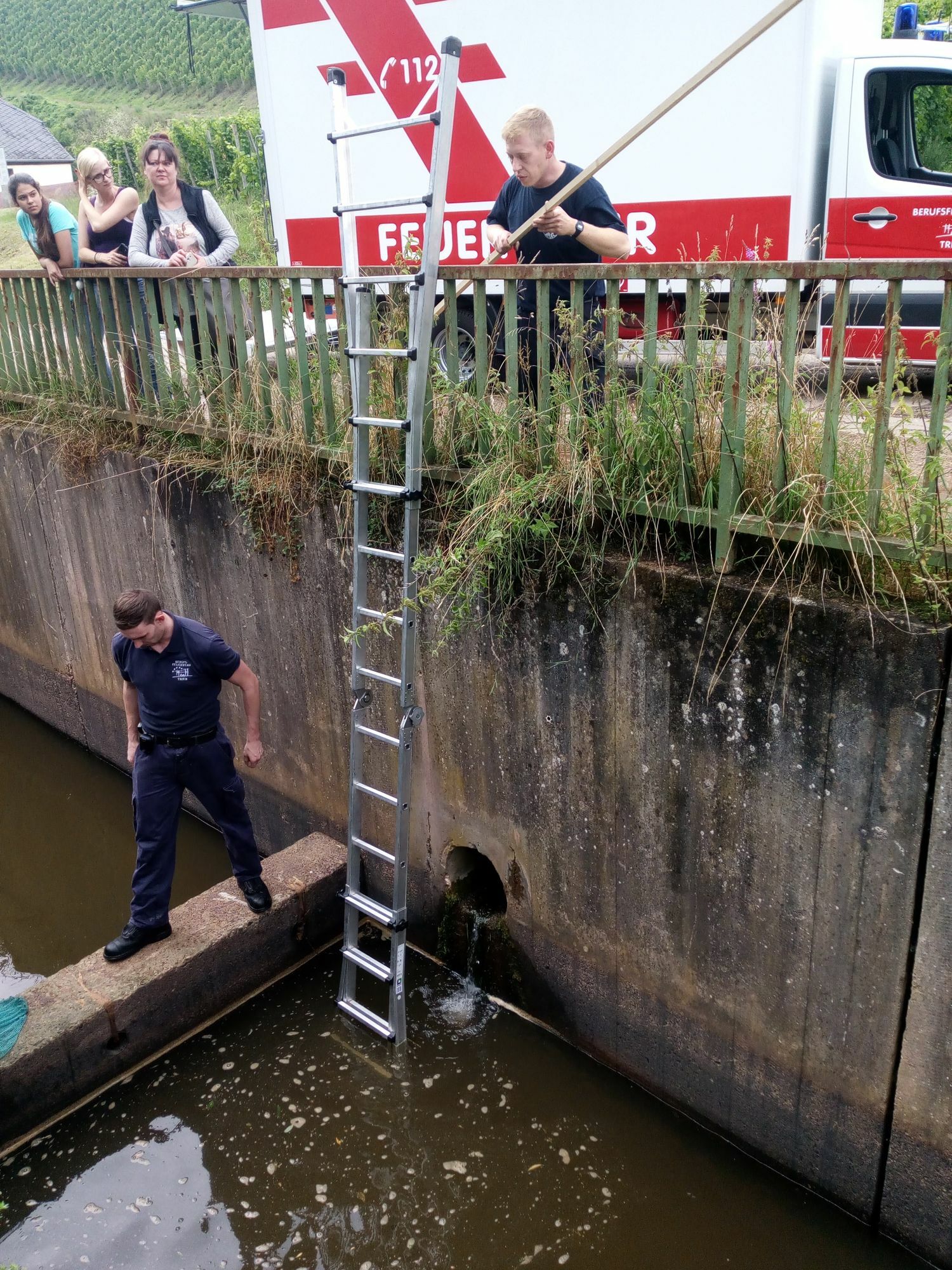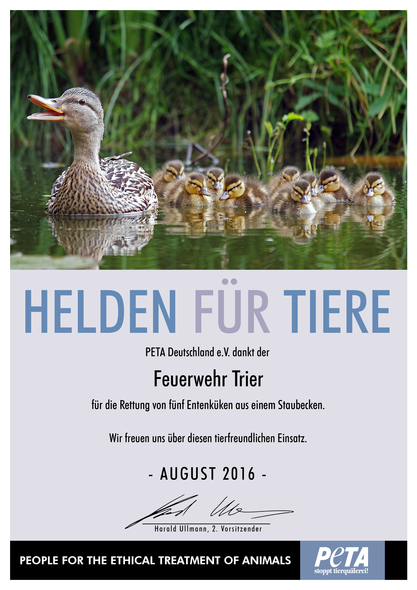 Mit Hilfe einer Leiter und eines Korbes konnte ein Feuerwehrmann die Entenfamilie einfangen und an einem kleinen Teich in der Nähe zurück in die Freiheit entlassen. Für ihren tierfreundlichen Einsatz zeichnet die Tierrechtsorganisation Peta nun die Feuerwehr Trier mit einer „Helden für Tiere“-Urkunde aus.
