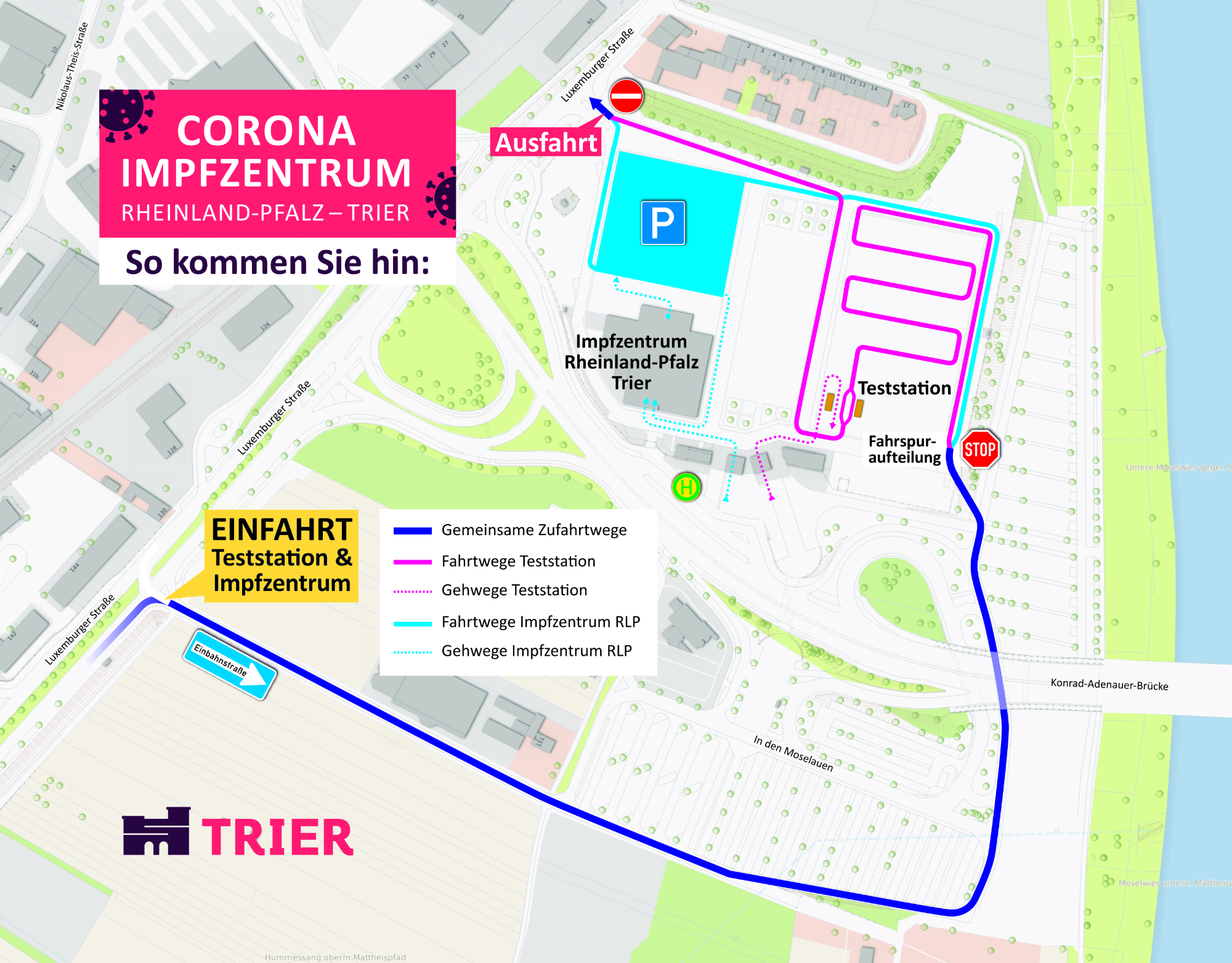 Geimpft werden gemäß Bundesverordnung zunächst vor allem Seniorinnen und Senioren im Alter von über 80 Jahren, die aufgrund ihrer Anfälligkeit für einen schweren Krankheitsverlauf besonders schutzbedürftig sind. Unabdingbare Voraussetzung für die Impfung ist eine vorherige Terminvereinbarung, die über die von der Landesregierung eingerichtete zentrale Telefonvermittlung unter 0800/5758100 oder online unter impftermin.rlp.de möglich ist. An den ersten beiden Tagen werden im Trierer Impfzentrum jeweils rund 200 Impfdosen zur Verfügung stehen. Die Einrichtung ist zunächst mit 20 Mitarbeiterinnen und Mitarbeitern besetzt, die Kapazität kann jedoch bei Bedarf schnell ausgeweitet werden. Die Zufahrt zum Impfzentrum ist nur über die Straße In den Moselauen möglich. Von dort wird der Verkehr auf das Messeparkgelände geleitet, wo ausreichend Parkplätze zur Verfügung stehen. Die Abfahrt erfolgt über die Luxemburger Straße. Eine Anfahrt mit den öffentlichen Verkehrsmitteln ist ebenfalls sehr gut möglich: Die Stadtbuslinie 3 fährt die Haltestelle Messepark alle zwanzig Minuten an. Ab Montag, 11. Januar, wird auch die Linie 1 diese Haltestelle auf ihrer derzeitigen Ausweichroute aufgrund der Sperrung an der Römerbrücke im Zehn-Minuten-Takt anfahren. Für Patientinnen und Patienten, die mit dem Bus, zu Fuß oder mit dem Fahrrad ankommen, ist direkt an der Bushaltestelle ein Zugang zum Messepark geöffnet. (RED)