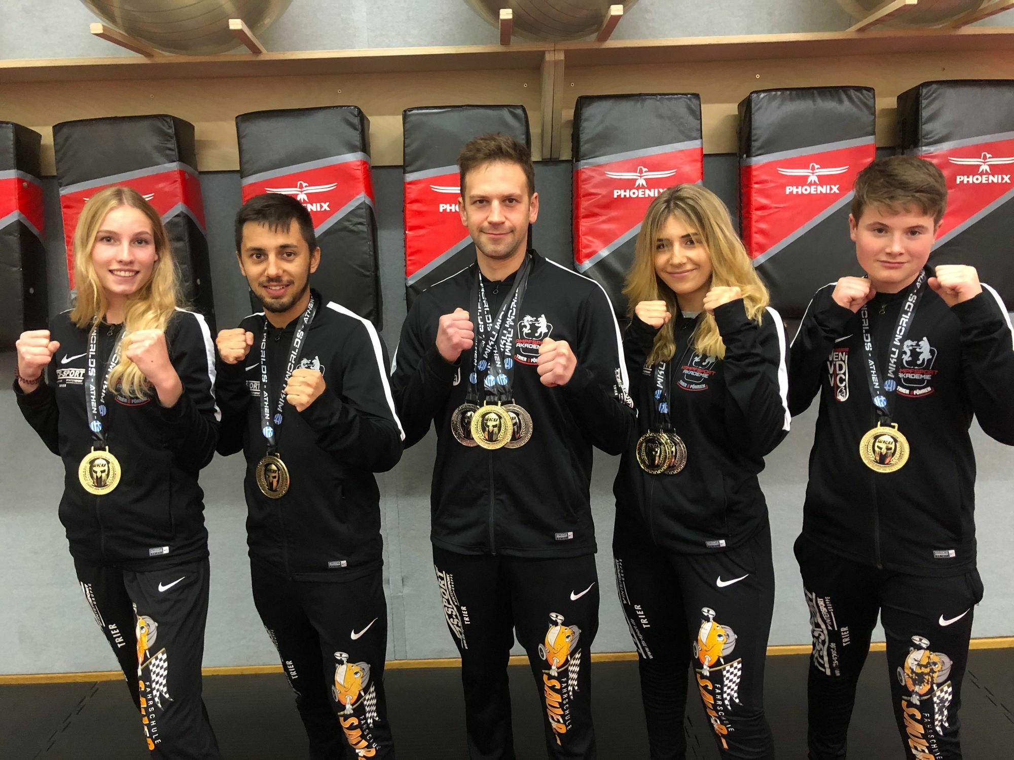 Aus Trier gingen an den Start Till Knopp in der Kategorie Leichtkontakt (LK) Kids +50kg, Bonnie Marie von Juterzenka im LK Jugend -55kg, Ajla Mujic im LK Jugend und Kick-Light (KL) Jugend +65kg, Samih Mese im Vollkontakt Kickboxen bei den Herren -60kg und Dennis Ullrich im LK und KL Herren -75kg. Till Knopp, der jüngste des Teams, kämpfte Leichtkontakt bei den Kids in der Gewichtsklasse +50kg. Er kämpfte sich bei seiner ersten WM bis ins Finale und gewann dort nach einem intensiven Kampf gegen seinen deutschen Kontrahenten aus Karlsruhe und wurde Weltmeister. Bonnie Marie von Juterzenka kämpfte sich durch eine der vollsten Kategorien des Turniers Leichtkontakt Jugend -55kg gegen Gegner aus Wales, USA und Deutschland bis ins Finale wo sie gegen die mehrfache Weltmeisterin aus Bonn in einem wunderbaren Kampf die Nase vorne hatte und sich ebenfalls den Weltmeistertitel sicherte. Ajla Mujic kämpfte sich in den Kategorien Kick-Light und Leichtkontakt Jugend +65kg ins Finale. Im Kick-Light verlor sie knapp gegen eine starke Kämpferin aus den USA, im Leichtkontakt hingegen konnte sie sich als dritte des Teams nach einem harten Kampf die Goldmedaille schnappen. Samih Mese stieg in den Ring bei den Herren -60kg Vollkontakt und musste sich im Halbfinale gegen einen klasse Kämpfer aus Frankreich geschlagen geben. Er belegte somit den dritten Platz. Dennis Ullrich kämpfte Leichtkontakt und Kick-Light bei den Herren -75kg. Er hatte in beiden Kategorien allerhand zutun gegen Gegner verschiedener Nationen, was ihn nicht davon abhielt in beiden Kategorien ins Finale einzuziehen. Im Kick-Light schaffte auch er es sich den ersten Platz zu sichern, während er im Leichtkontakt das Finale knapp an einen Schotten abgeben musste. Insgesamt ein gigantischer Erfolg für die Trierer Kickboxer in Form von viermal Gold, viermal Silber und einmal Bronze. Eine Pause ist jedoch nicht in Sicht, da die nächste Saison vor der Tür steht. Foto: FF