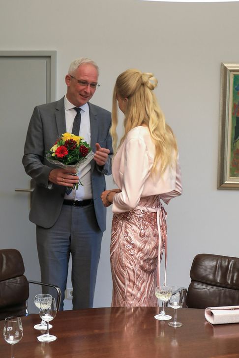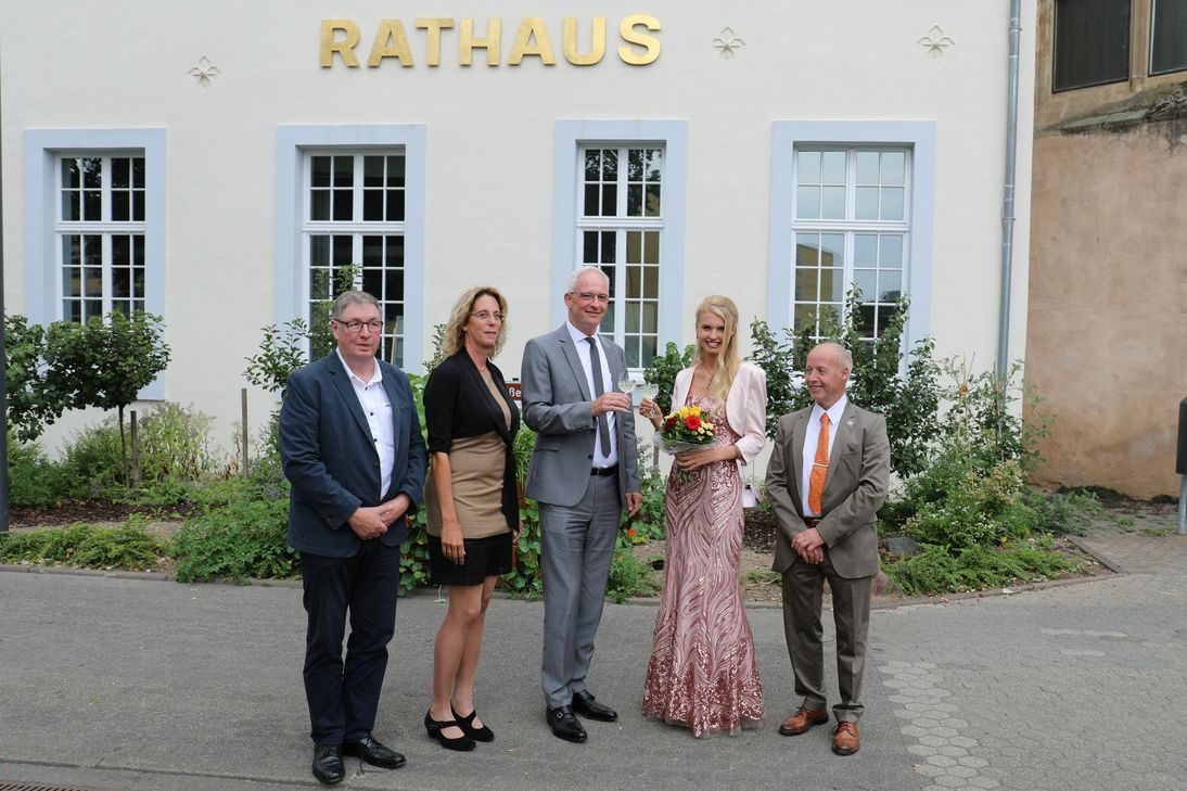 Für Winzerchef Peter Terges gehen damit direkt zwei Wünsche wahr: Eine Weinköningin aus Trier-Olewig und eine Frau als Schirmherrin. Beim Besuch im Rathaus lobte Oberbürgermeister Wolfram Leibe seine strategische, gute und schnelle Entscheidung bei der Wahl. Zudem freute er sich, dass er nun beim Weinfest zwei Damen auf Augenhöhe zur Seite habe - sowohl die neue Weinkönigin, als auch die Schirmherrin sind über 1.80 Meter. Leibe betonte, dass Trier immer mehr auch als Weinstadt gesehen werde und freue auf die gemeinsamen Auftritte. Am Mittwoch, 1. August, findet die offizielle Krönung von Katja Leidendecker auf dem Festgelände in Olewig statt. Hierzu haben sich bereits 25. ehemalige Weinhoheiten angemeldet, um bei der Zeremonie anwesend zu sein. MV/RED, Fotos: Valentin