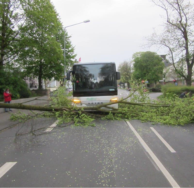 Der mit zehn Personen besetzte Linienbus war gegen 6.50 Uhr befuhr auf der Nordallee in Richtung Brüderkrankenhaus unterwegs. Kurz bevor der Bus die Stelle passierte, stürzte in Höhe der Nordallee 7 ein Baum von einem privaten Geläunde auf die Straße. Der Busfahrer konnte den Bus nicht mehr rechtzeitig anhalten und fuhr über den Baum. Hierbei entstand ein leichter Sachschaden am Bus. Von den Insassen wurde niemand verletzt. Im Umkreis des fallenden Baums hielt sich weder ein Fußgänger oder Radfahrer auf. Die Nordallee war für die Dauer der Aufräumarbeiten für circa 45 Min von der Engelstraße bis zur Lindenstraße voll gesperrt. Der Verkehr wurde umgeleitet. Der Baum wurde von einem Bautrupp des Tiefbauamts in Stücke zerlegt und im Anschluss auf das Gelände der evangelischen Kirchengemeinde gebracht.