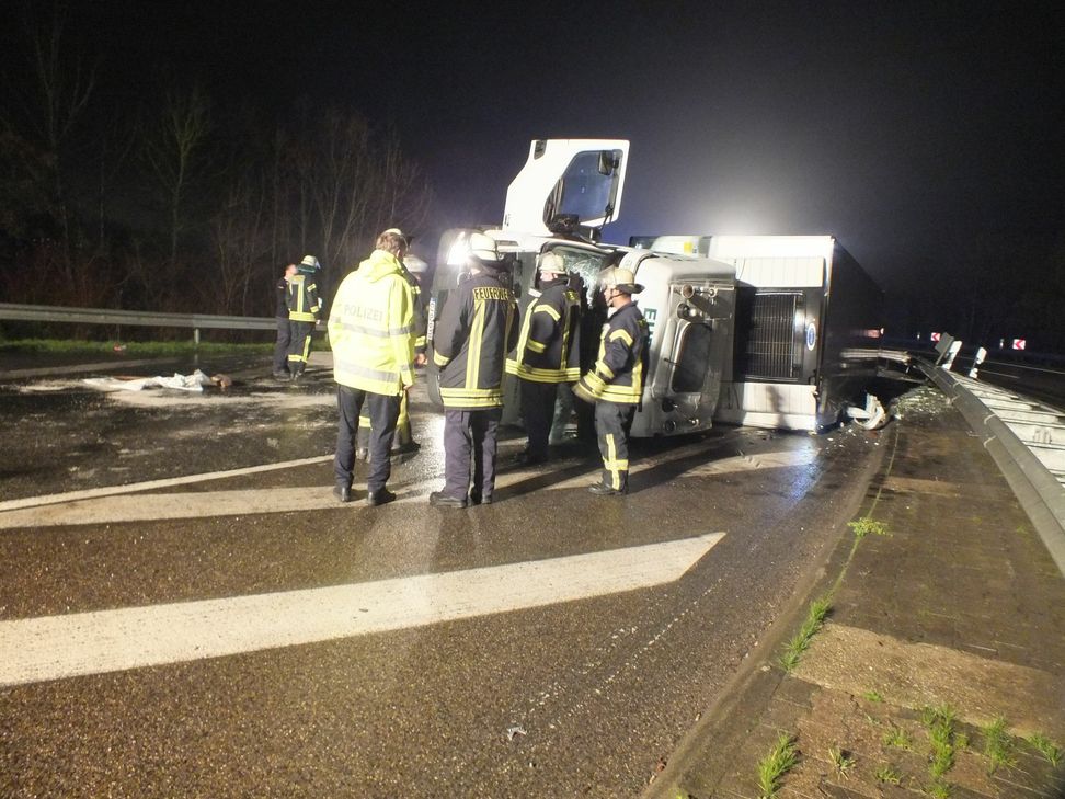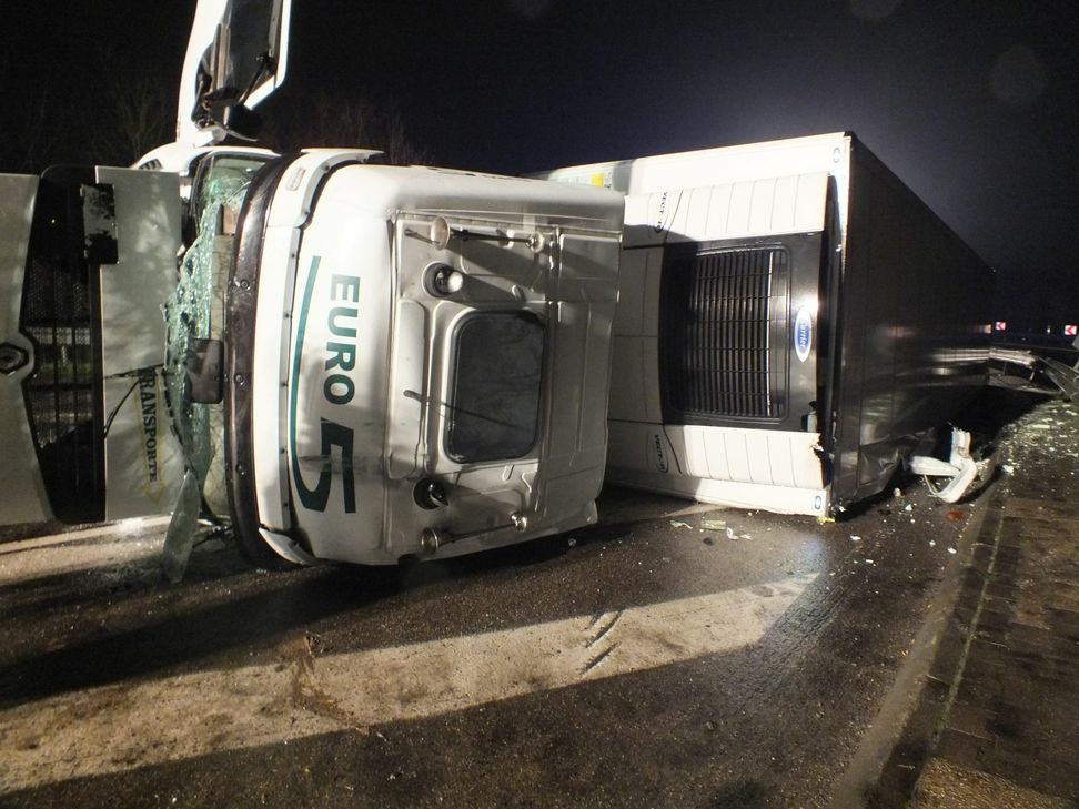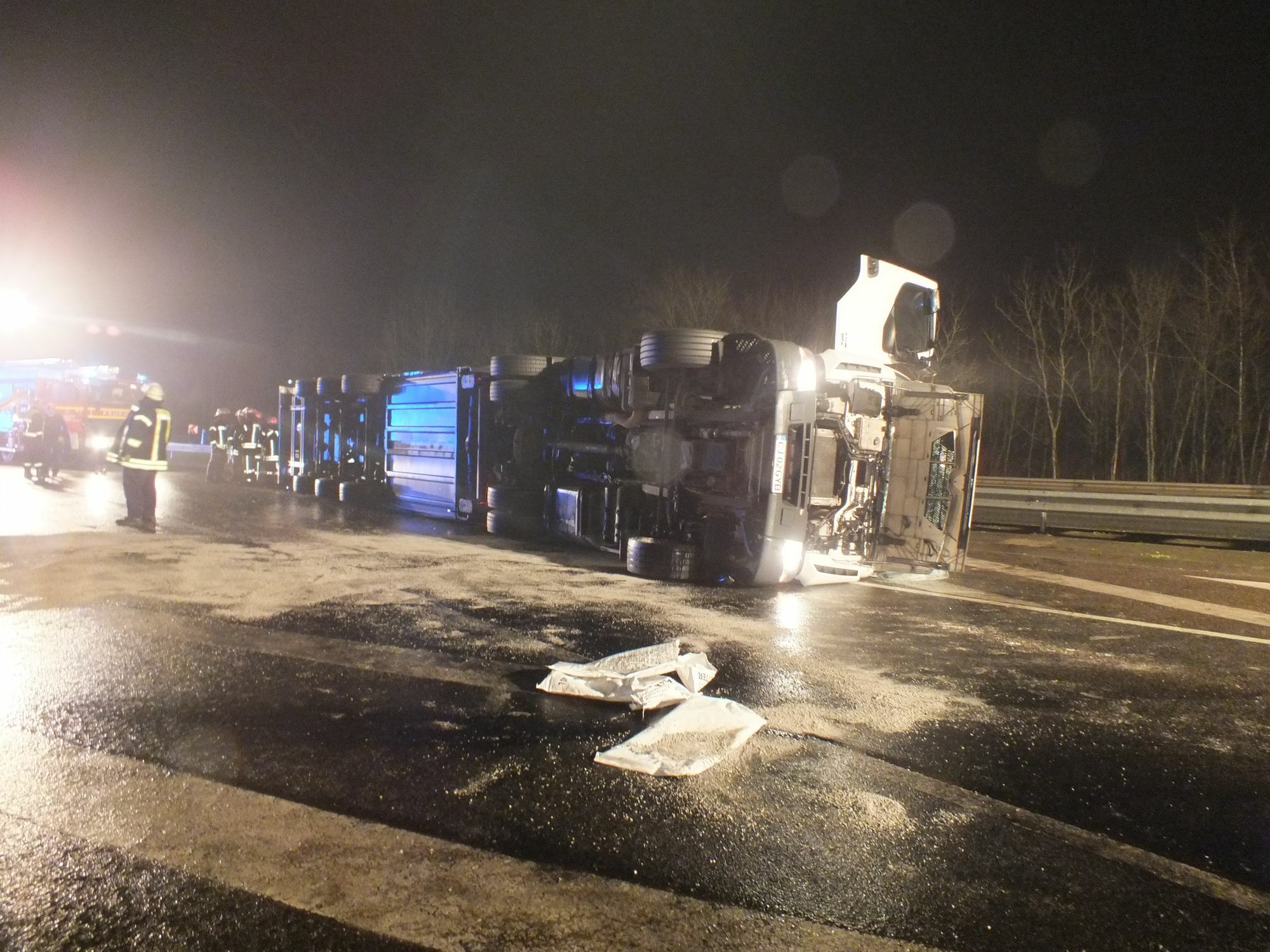 Ein rumänischer Sattelzug ist am 16. Dezember um 5.30 Uhr am Autobahndreieick Moseltal umgekippt. Der LKW war mit Mandarinen beladen, die per Hand umgeladen werden mussten. Verletzt wurde niemand.
