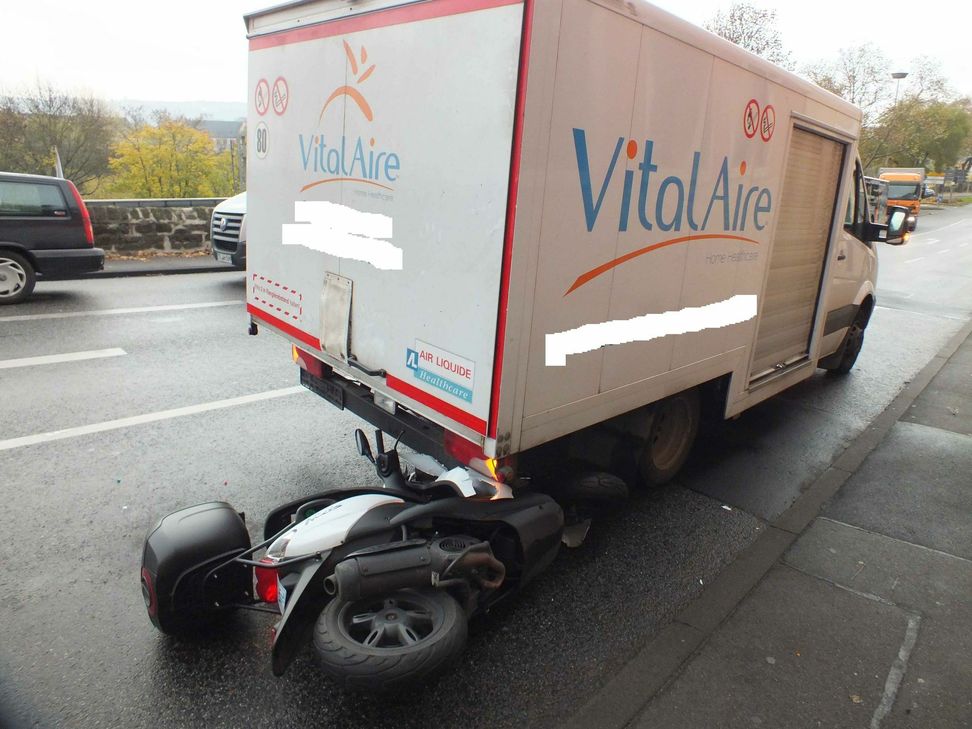 Zu einem schweren Unfall ist es am Donnerstag, 12. November, gegen 8.40 Uhr im Bereich der Kreuzung B51/Bitburgerstraße und der Kaiser- Wilhelm-Brücke gekommen. Aus bislang ungeklärter Ursache geriet ein Rollerfahrer unter den vor ihm fahrenden Transporter.