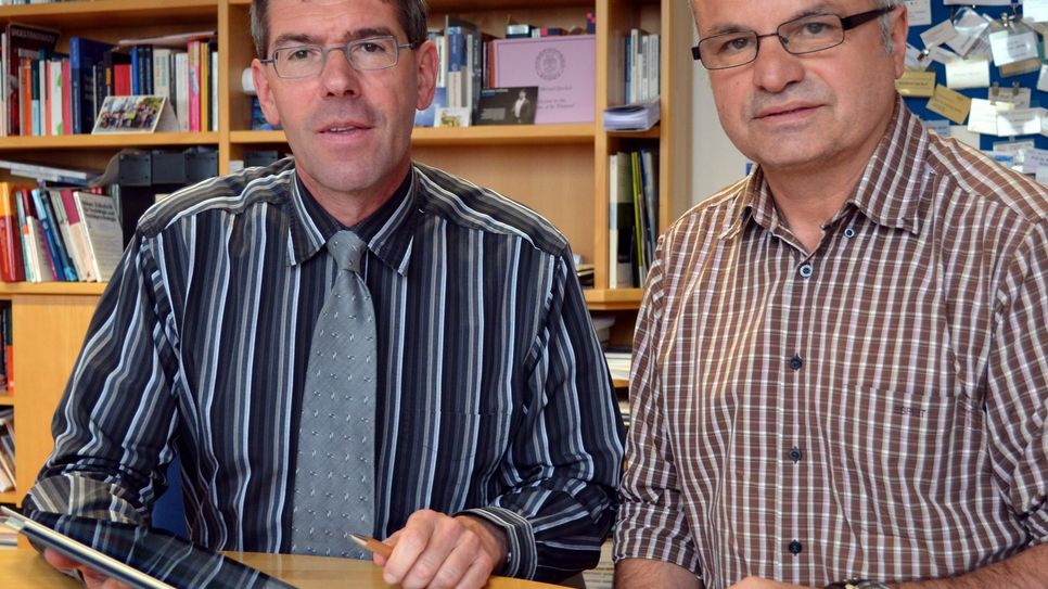 Uni-Präsident Michael Jäckel (links) und Aziz Yüksek vom Akademischen Auslandsamt möchten Flüchtlingen den Weg ins Studium vereinfachen. Foto: Finkenberg