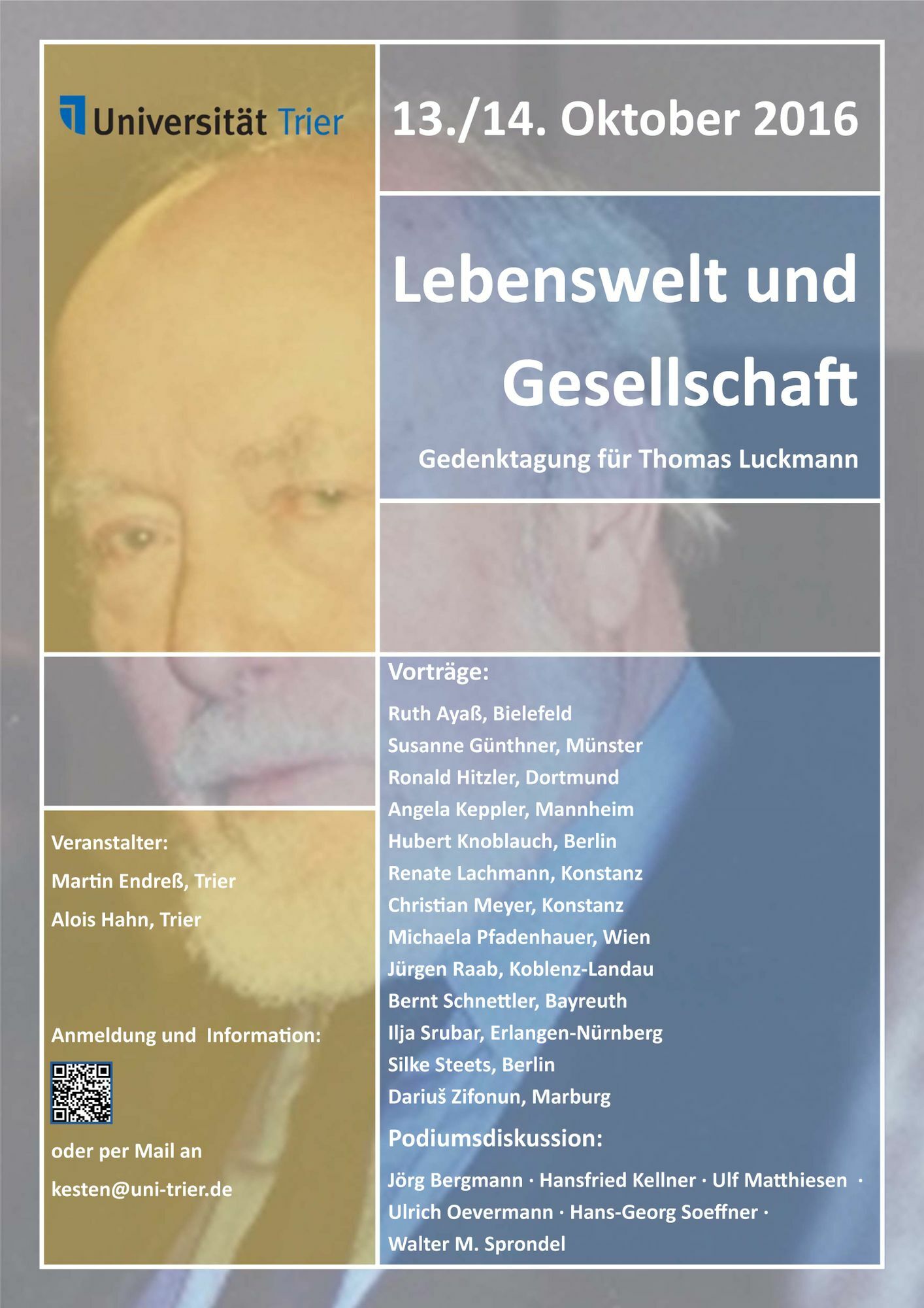 Die Tagung "Lebenswelt und Gesellschaft" im Gedenken an Thomas Luckmann findet am 13. und 14. Oktober ab 12.30 Uhr in Raum 302 (V-Gebäude, Campus I) statt. Die Leitung haben Prof. Dr. Martin Endreß und Prof. em. Dr. Alois Hahn. Die Teilnahme an der Tagung ist kostenlos, um Anmeldung wird gebeten.