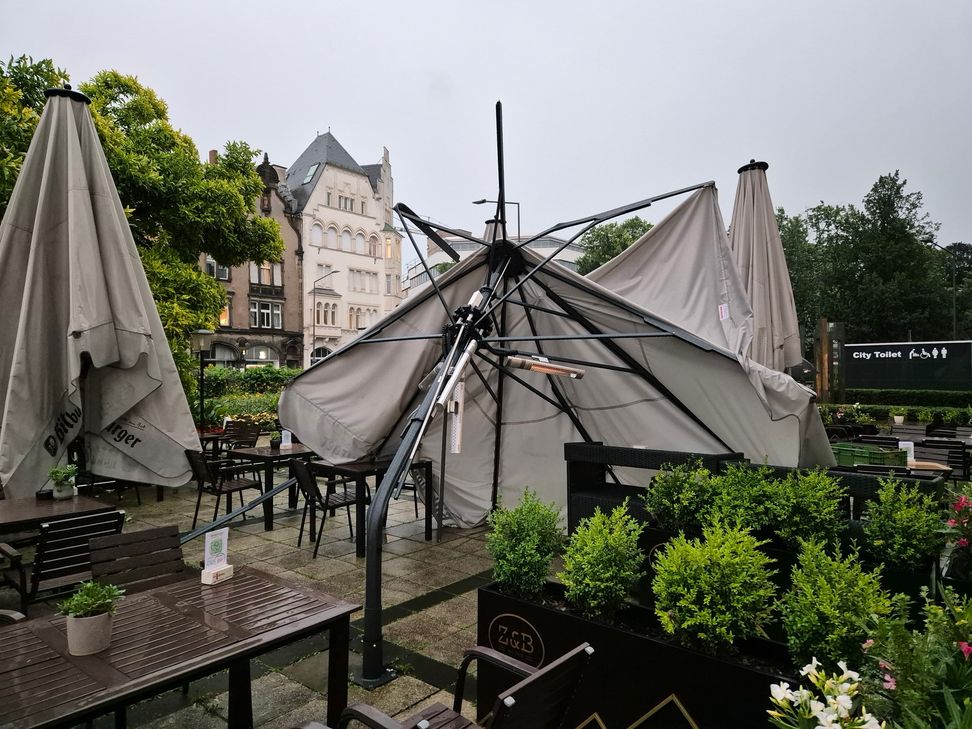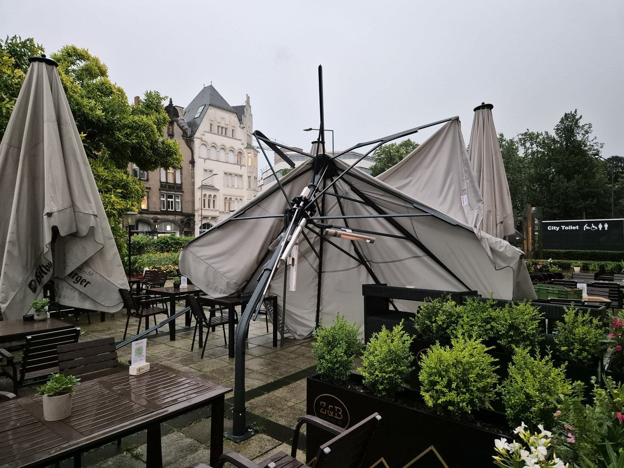 Der wohl spektakulärste Einsatz gab es auf dem Hauptmarkt in der Trierer Fußgängerzone. Auf X ist auf einem kurzen Video zu sehen, wie starke Fallböen sich nieder lassen. Schließlich wird das Dach des dortigen Weinstandes angehoben und es fliegt durch die Luft. Eine Passantin wird hierbei, laut Polizei, getroffen und leicht am Kopf verletzt. Die Berufsfeuerwehr rückt schnell an, um das Gebiet erst einmal weiträumig abzusichern. Dann wurden die losen herumfliegende Teile eingesammelt und gesichert. Ein Augezeuge berichtet, dass man noch gemütlich am Weinstand stand und es von einer auf die andere Minute dunkel wurde und schon kam der sehr starke Wind. Laut dem deutschen Wetterdienst lag die stärste Böe an der Messstation auf dem Petrisberg bei 67,3 km/h. Im gesamten Stadtgebiet musste die Feuerwehr zu umgestützen Bäumen ausrücken. So unter anderem auf die Verbindungsstrecke von Trier- Euren nach Trierweiler, nach Trier- West und auf die Nordallee. In der schlug der Blitz in einen Baum ein. Gleiches Bild auch am Radweg hinter der Jugendherberge. Dort erzählt eine Familie, die gerade in den Ferein sind, dass es plötzlich einen lauten Knall gab und schon riss ein Baum im mehrere Teile und stürzte zu Boden. In der St. Mergener- Straße stüzten ebenfalls große und schwere Äste auf umliegende Garagen und Fahrzeuge. Die Feuerwehr rückte unter anderem mit einer Drehleiter an, um hier Aufräumarbeiten leisten zu können.