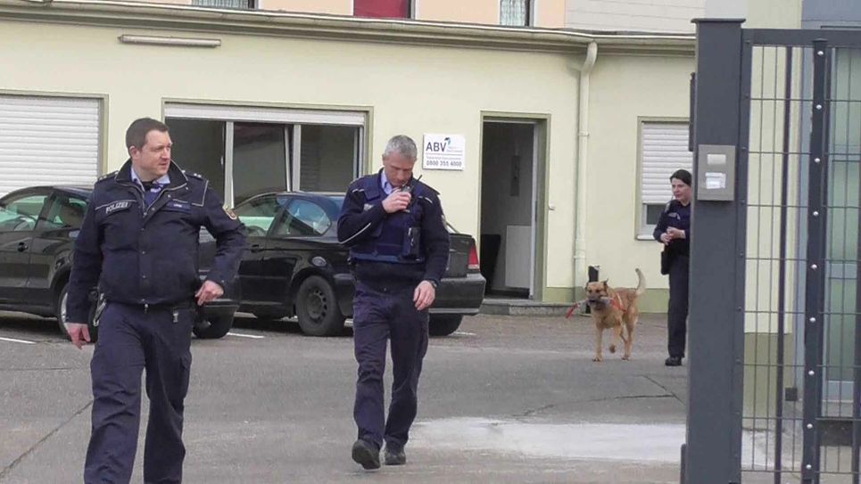 Gegen 14 Uhr hatte ein Unbekannter bei der Firma angerufen und damit gedroht, eine Bombe zu zünden. Polizei und Feuerwehr waren im Einsatz. Die Güterstraße wurde sofort gesperrt und das Gebäude evakuierte. Die Polizei suchte mit einem Sprengstoffspürhund das Gebäude ab. Eine Bombe konnte nicht gefunden werden. Die Polizei gab nun Entwarnung. Fotos: Agentur Siko