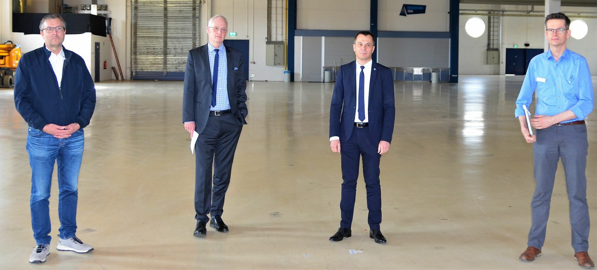 Hielten auf der Pressekonferenz im Messepark den gebotenen Abstand (v.l.): Dr. Christian Sprenger, Geschäftsführer Klinikum Mutterhaus, Oberbürgermeister Wolfram Leibe, Christian Weiskopf, Regionalleiter der BBT Gruppe Region Trier und Privatdozent Dr. Wolfgang Thomas, Chefarzt Kinder- und Jugendmedizin im Mutterhaus.