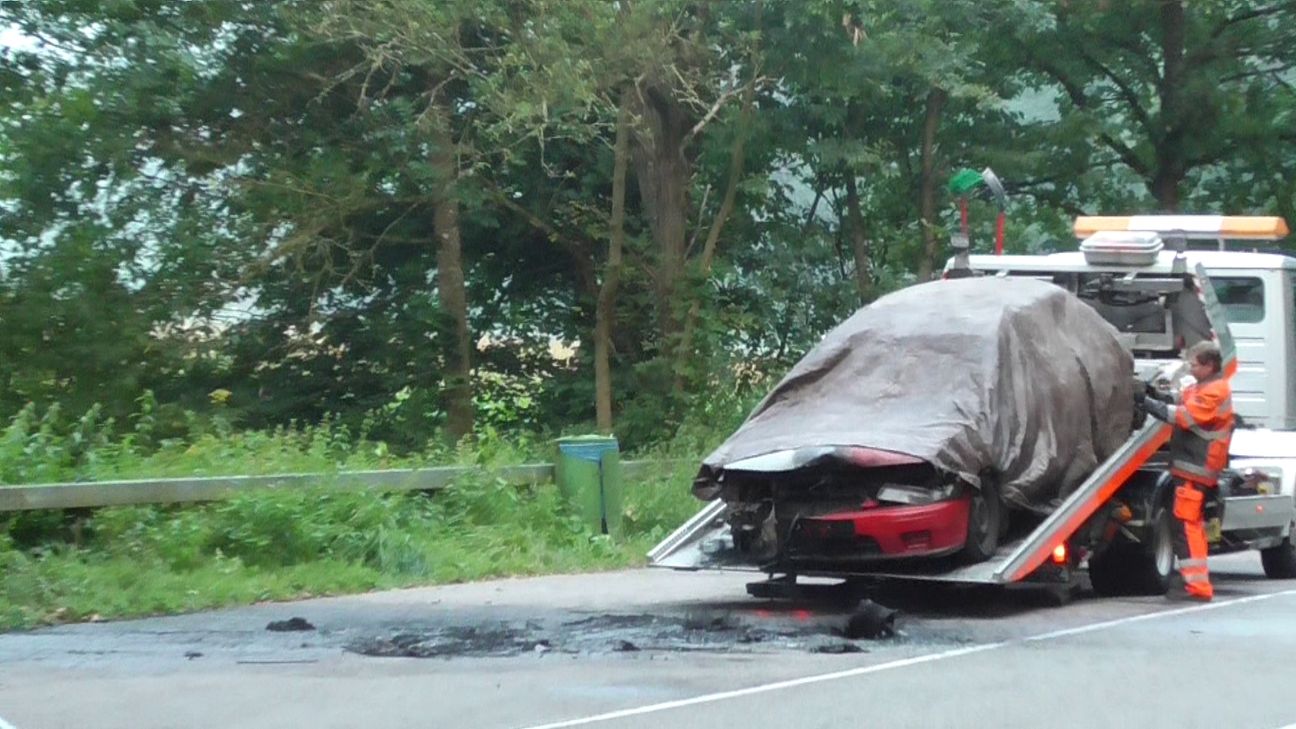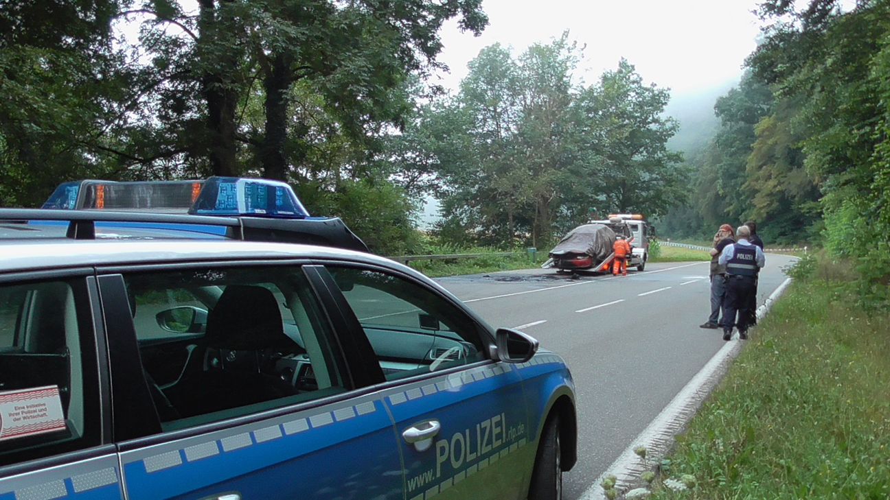 In dem völlig ausgebrannten Auto fanden Feuerwehr und Polizei eine Leiche. Laut Obduktion handelt es sich um eine Frau. Die Identität ist bisher nicht zweifelsfrei geklärt. Das Auto ist ein mattroter Mazda 323 älteren Modells. Er stand auf einem unmittelbar an der B 422 gelegenen Parkplatz zwischen Kordel und Trier-Ehrang. Bisherigen Erkenntnissen zufolge stand das Fahrzeug bereits lichterloh in Flammen, als die Zeugen Notruf alarmierten. Die Polizei sucht nach Zeugen und fragt: Ist jemandem gestern Abend oder den Abenden/Nächten zuvor ein solches Fahrzeug in der Parkbucht oder in der Nähe aufgefallen? Hinweise an die Kripo in Trier unter Telefon 0651/9779-2290. Fotos/Video: Agentur Siko