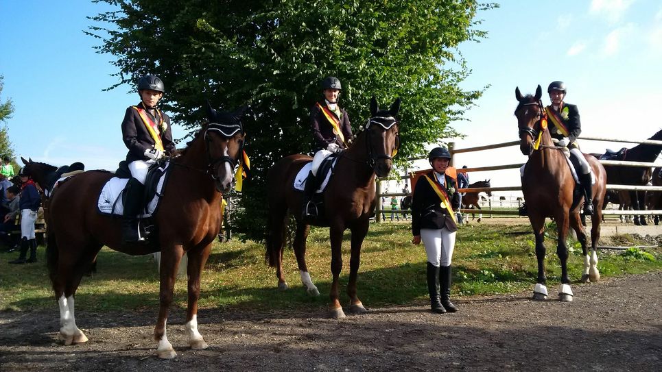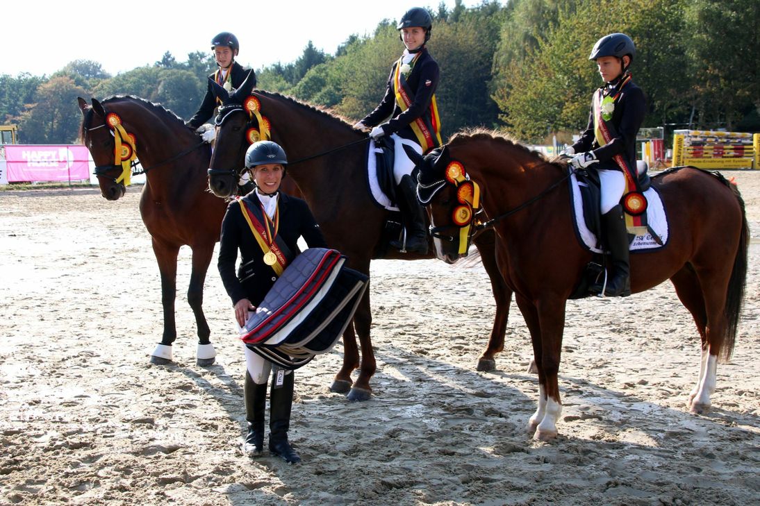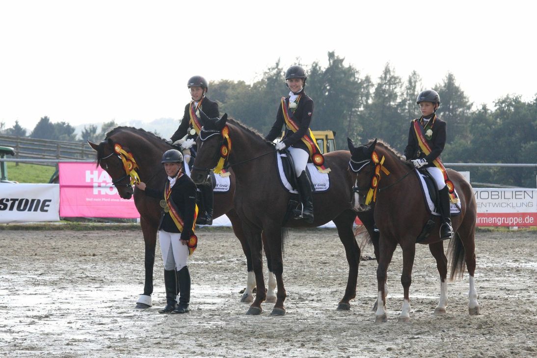 Trainerin Caroline Feid-May vom Gestüt Hohensonne konnte aber nicht nur auf das siegende Team stolz sein. Der Verein war mit zwei weiteren Vierkampf-Mannschaften, für die Katharina Candels, Larissa Fricke, Elena Koster, Mariella Koster, Laura Schiffels und Emelie Weydert starteten, angetreten. Auch hier können sich die Ergebnisse sehen lassen: Platz fünf und sechs im rheinland-pfälzischen Vergleich, was einem vierten und fünften Platz in der Verbandswertung Rheinland-Nassau entspricht. Die Hohensonner Jugendmannschaft mit Moritz Berg, Katharina Candels, Leonie Dühr, Larissa Fricke, Katharina Theis, Nele Weber und Emelie Weydert, die in Einzel- und Mannschaftsdressuren und Springprüfungen der Klasse A an den Start ging, lag bis zum entscheidenden Springen auf Platz zwei.