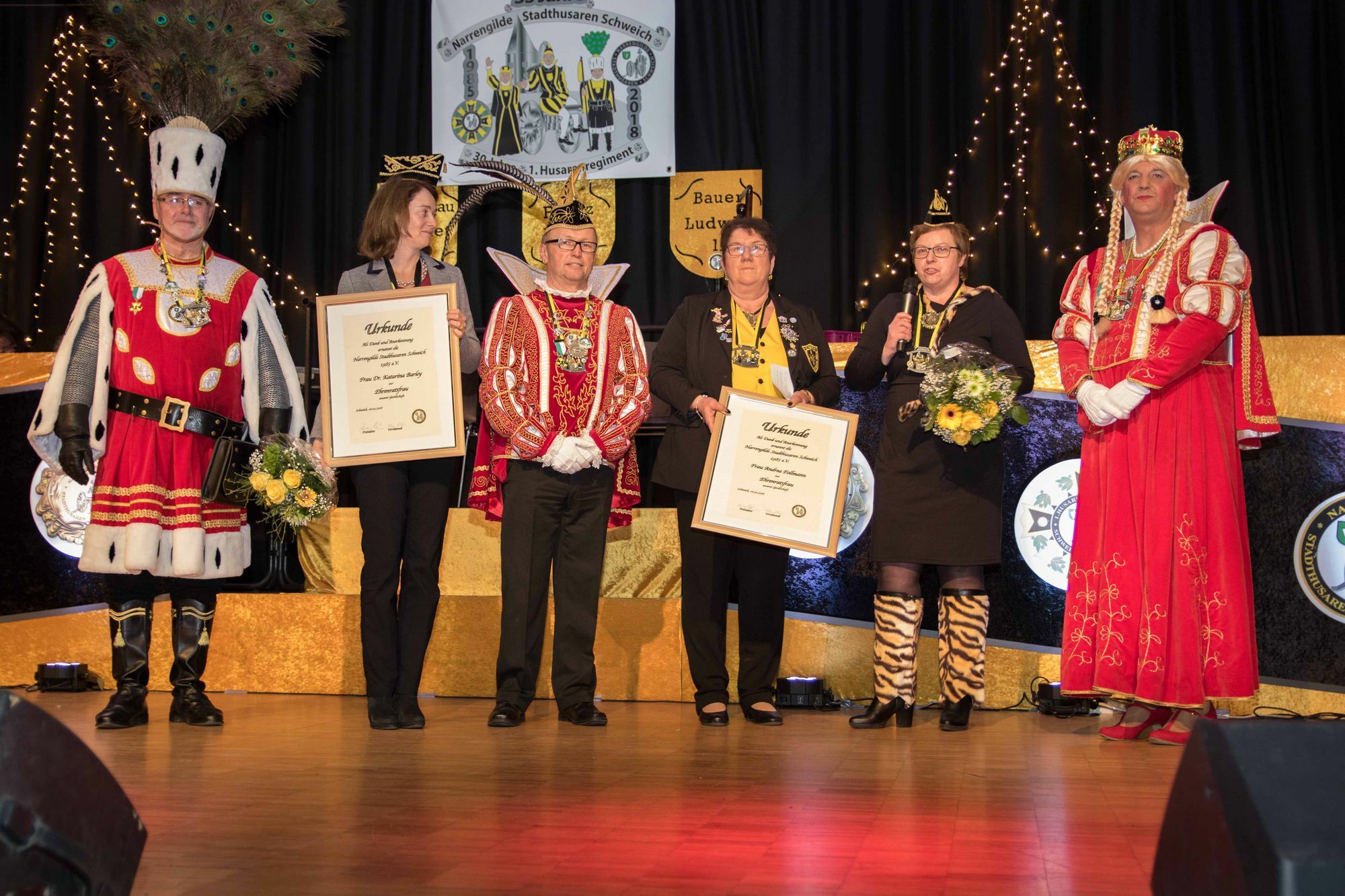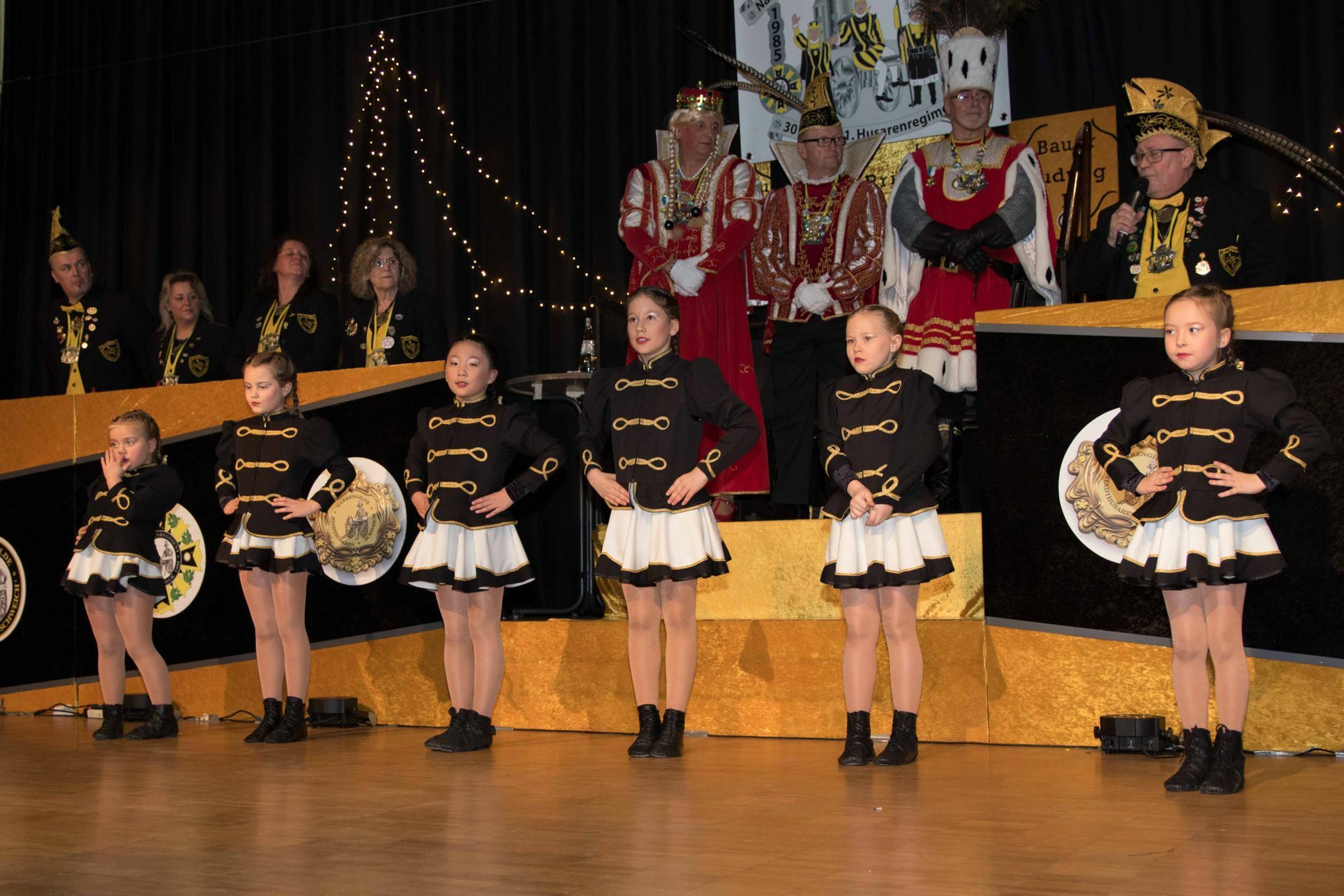 Danach wirbelte die 7-jährige Maya Niesel (HCG Hetzerath) als Tanzmariechen über die Bühne. Weiter ging es mit der Kindergarde Stadthusaren, die mit ihrem schwungvollen Gardetanz das Publikum begeisterten. Solomariechen Mia Burg, Tanzmariechen der Stadthusaren Schweich, zeigte anschließend ihr tänzerisches Können. Um die zwar bereits recht gute Frauenquote in Verein noch weiter auszubauen, bat der Sitzungspräsident Rainer Möbius nun zwei weitere Damen zur Bühne: Andrea Follmann und Dr. Katarina Barley. Diese wurden zu Ehrenratsfrauen der Gesellschaft ernannt. Es folgten der Schautanz des KC Konz und die Gardeshow der Aktivengarde und des Husarenregimentes Schweich. Eine besondere Ehrung erhielt Joachim Wagner. Als Gründungsmitglied und ehemaliger Sitzungspräsident der Stadthusaren wurde er zum "Ehrenritter" ernannt. Werner Bodschard hielt die Laudatio auf den neuen Ehrenritter. Und was passiert wenn zwei Musiker zusammen auf der Bühne stehen? Sie musizieren! Mit Singspielen, die an alte Zeiten erinnerten. "Hab´ne Tante in Marokko" und "Wir sind die Musikanten und kommen aus dem Moselland" brachten die beiden Schwung und körperliche Bewegung ins Publikum und ernteten dafür tosenden Applaus. Elegant und sportlich präsentierte die Garde der KG Onner Ons 1865 Trier ihren diesjährigen Gardetanz. Eher ruhig wurde es danach mit der Gruppe Ladykracher. Sie verwandelten sehr humorvoll die Bühne in ein Pflegeheim der besonderen Art. Der temperamentvolle Solotanz von Alina Kiefer (Stadthusaren Schweich) brachte wieder Bewegung auf die Bühne. Bevor Pierre Klein vom RKK verdiente Mitglieder mit Verdienstorden auszeichnete. "The Uncoachables" , das Männerballett des KV Kordel entführten das Publikum in entfernte Galaxien. Lautstark wurde "Zugabe" gefordert. Die letze Ehrung des Abends übernahm Wolfgang Zingen und übergab die Urkunde des Landesverbandes RML im BDK zum 33-jährigen Jubiläum. Die Dreamdancer und "Et Quant Orchester" sorgten dann noch einmal für richtig Stimmung, ehe sich der Abend dem Ende neigte. MV, Fotos: Valentin