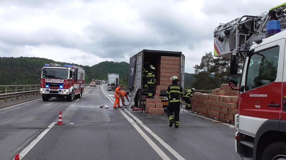 Der Anhäger war vermutlich wegen heiß gelaufener Bremsen am Anfang der Brücke in Richtung Luxemburg in Brand geraten. Auf dem Anhänger befand sich ein Container, der Milch geladen hatte. Der Fahrer des LKWs zog sich leichte Rauchverletzungen zu. Er konnte das Zugfahrzeug aber noch rechtzeitig abkoppeln. Für die Löscharbeiten und die Landung des Rettungshubschraubers musste die A 64 zwischen den Anschlusstellen Ehrang und Trier voll gesperrt werden. Die Sperrung wurde mittlerweile teilweise aufgehoben, der aufgestaute Verkehr fließt derzeit ab. Aufgrund der Bergungsarbeiten wird aber voraussichtlich noch mit Verkehrsbehinderungen in den nächsten Stunden zu rechnen sein. Neben der Autobahnpolizei Schweich waren weitere Streifenwagen der umliegenden Polizeiinspektion sowie die Autobahnmeisterei Schweich im Einsatz. Die genaue Schadenshöhe ist noch nicht bekannt. Fotos: Agentur Siko