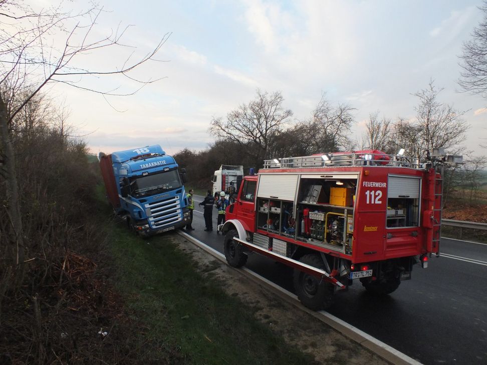 Zu einem Unfall ist es am 5. April gegen 19.25 Uhr auf der B51 bei Welschbillig gekommen. Ein polnischer LKW war von der Fahrbahn abgekommen und im angrenzenden Straßengraben stecken geblieben.