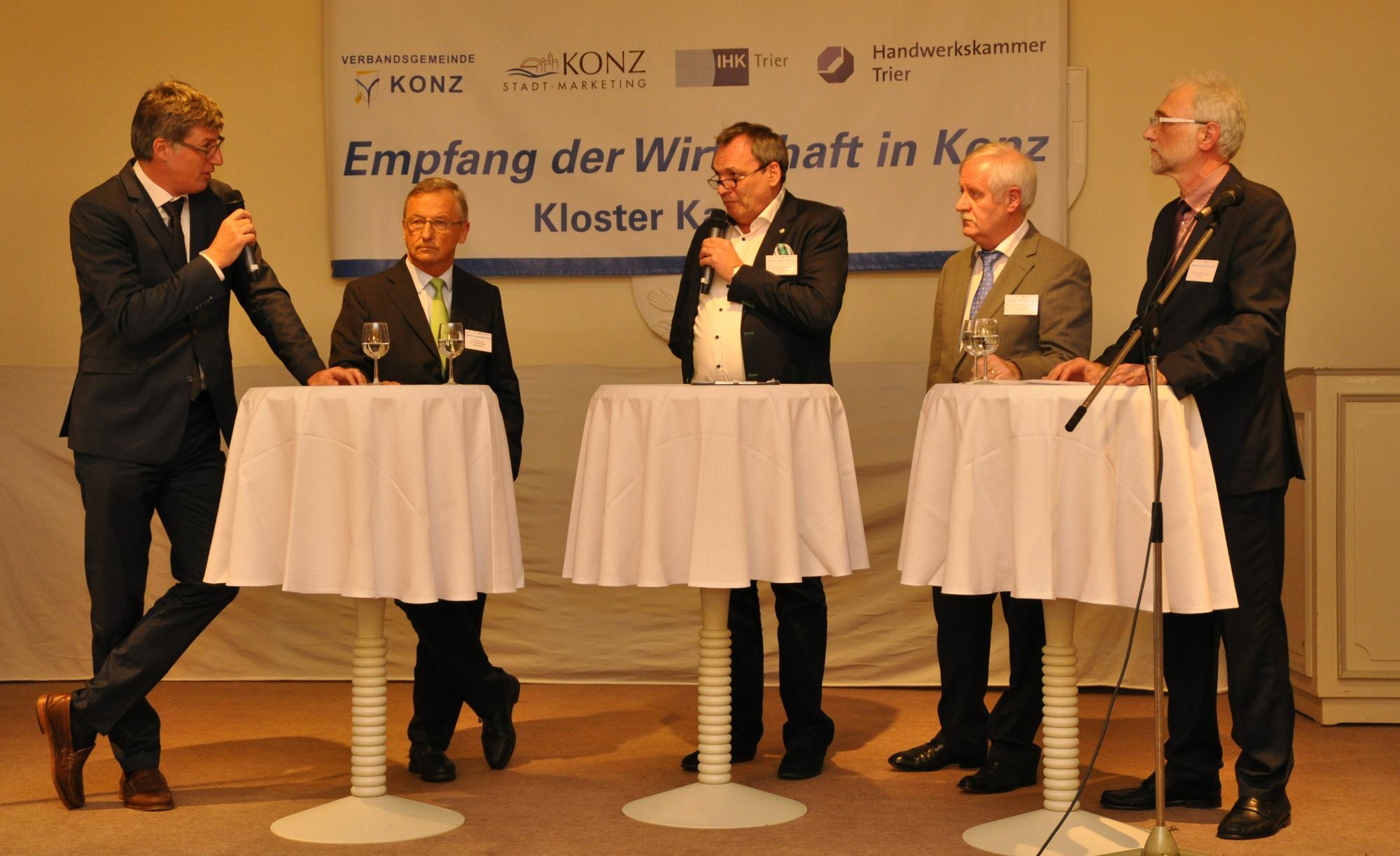 Moderiert von Thomas Vatheuer, ging es kurzweilig, aber nicht ohne Tiefgang durch verschiedene Themen. Mit Bürgermeister Dr. Karl-Heinz Frieden auf dem Podium standen Dr. Jan Glockauer, Hauptgeschäftsführer der Industrie- und Handelskammer Trier, Dr. Manfred Bitter, Hauptgeschäftsführer der Handwerkskammer Trier, und Ernst Holbach, Vorsitzender des Konzer Stadtmarketing-Vereins.