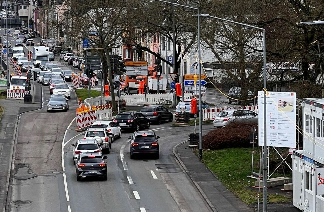 Im Rahmen der Baustelleneinrichtung ist die Linksabbiegespur aus der Bonner Straße in die Kölner Straße ab Freitag, 9. Februar, bis voraussichtlich 16. Februar gesperrt. Die Umleitung verläuft über die Bitburger Straße bis zur Wendemöglichkeit an der Hochschule und von dort in Gegenrichtung zurück auf die Bitburger Straße und geradeaus weiter auf die Kölner Straße. Am Übergang der Bitburger Straße in die Kölner Straße ist eine Fahrspur gesperrt. Linksabbieger in die Bonner Straße werden deshalb in einer Spur zusammen mit dem Geradeausverkehr geführt.