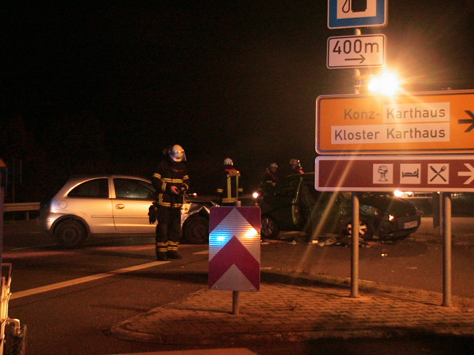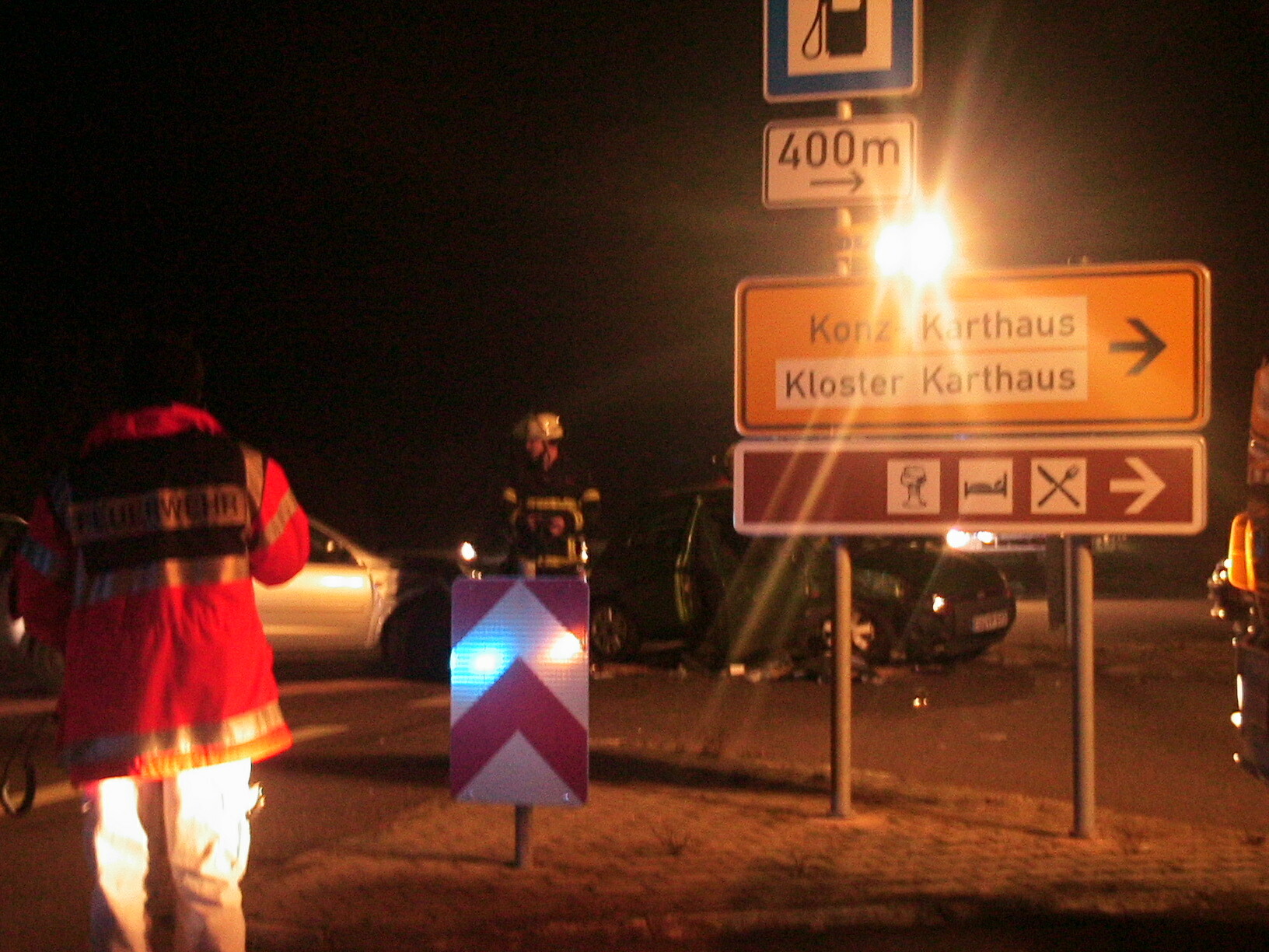 Nach ersten Informationen wollte ein Auto von Karthaus kommend auf die B 51 abbiegen. Dabei übersah der Fahrer offenbar ein anderes Fahrzeug, das sich auf der Bundesstraße befand. Auf der Kreuzung krachten die Fahrzeuge zusammen. Dabei wurden mindestens drei Personen verletzt. Die B 51 war für die Dauer der Rettungsaarbeiten voll gesperrt. An den beiden Fahrzeugen entstand Schaden in unbekannter Höhe. Im Einsatz waren die Polizeiinspektion Saarburg, die Berufsfeuerwehr Wache 1und Wache 2, drei Rettungswagen und Notarzt der Berufsfeuerwehr und das DRK Konz.